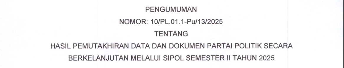 Berdasarkan hasil verifikasi terhadap data dan dokumen pemutakhiran Partai Politik, dengan ini disampaikan hasil pemutakhiran data dan dokumen Partai Politik secara berkelanjutan melalui Sistem Informasi Partai Politik (Sipol) Semester II Tahun 2025, sebagai berikut: