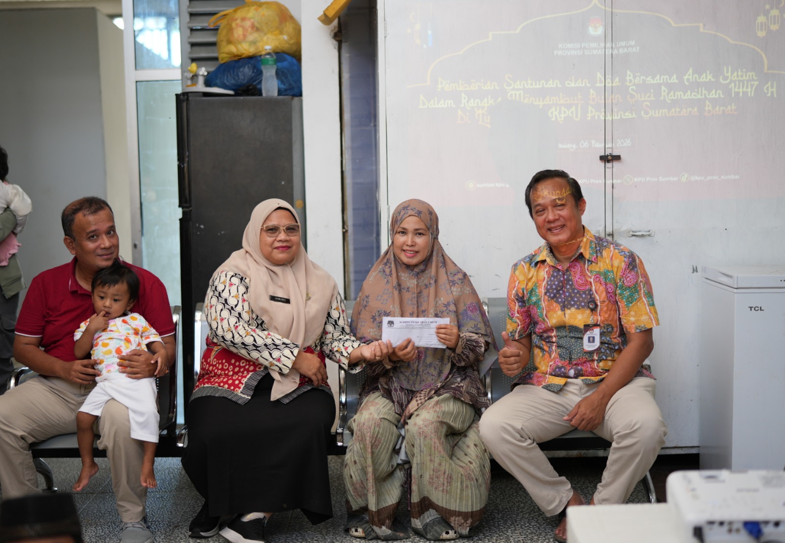 Padang- sumbar.kpu.go.id - Komisi Pemilihan Umum (KPU) Provinsi Sumatera Barat memberikan santunan dan doa bersama anak yatim di Panti Asuhan LKSA Bayi dan Balita Jasmin Nabila Inayah, Ulak Karang Utara, Padang, Jumat (6/2/2026). Kegiatan ini merupakan bentuk solidaritas sekaligus menyambut datangnya bulan suci Ramadhan 1447 H. Kegiatan ini dihadiri langsung oleh sejumlah pejabat struktural di lingkungan Sekretariat KPU Provinsi Sumatera Barat.