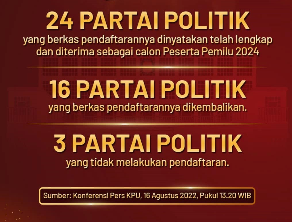 Padang, sumbar.kpu.go.id – Setelah menerima pendaftaran dan penyampaian dokumen pendaftaran partai politik selama 14 hari, Komisi Pemilihan Umum Republik Indonesia (KPU RI) akhirnya selesai memeriksa seluruh berkas pendaftaran. Sebanyak 40 partai politik mendaftar dan menyerahkan berkas persyaratan ke KPU RI sejak 1 Agustus 2022 hingga 14 Agustus pukul 25.59 WIB. “Dari seluruh partai yang mendaftar, sebanyak 24 partai politik dinyatakan berkasnya lengkap, dan 16 lainnya berkas dikembalikan” terang Idham Kholik, Anggota KPU RI, saat gelaran jumpa pers yang dilakukan Selasa (16/8) di Kantor KPU RI, Jakarta. Saat ini kedua puluh empat parpol tersebut sedang dilakukan verifikasi administrasi hingga 11 September 2022 nanti.
