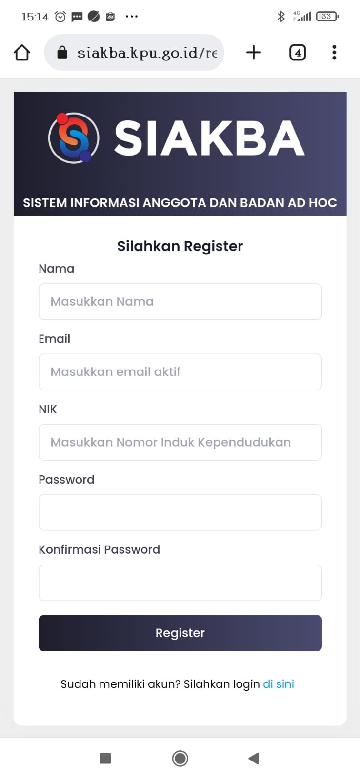 Bagi calon pelamar Badan Adhoc, yang anda butuhkan pertama kali sebelum melakukan pendaftaran adalah membuat akun SIAKBA di website https://siakba.kpu.go.id/. Untuk meregistrasi akun SIAKBA ini, anda perlu menyiapkan email aktif, menginputkan nama, NIK dan kata kunci akun (password). Selanjutnya sebuah pesan akan masuk ke email anda lengkap dengan tautan yang digunakan untuk memverifikasi akun SIAKBA yang baru saja anda daftarkan. Dengan meng-klik tautan tersebut, anda telah berhasil mengaktivasi akun. Anda akan dipersilahkan login kembali menggunakan email dan password yang telah anda buat sebelumnya.