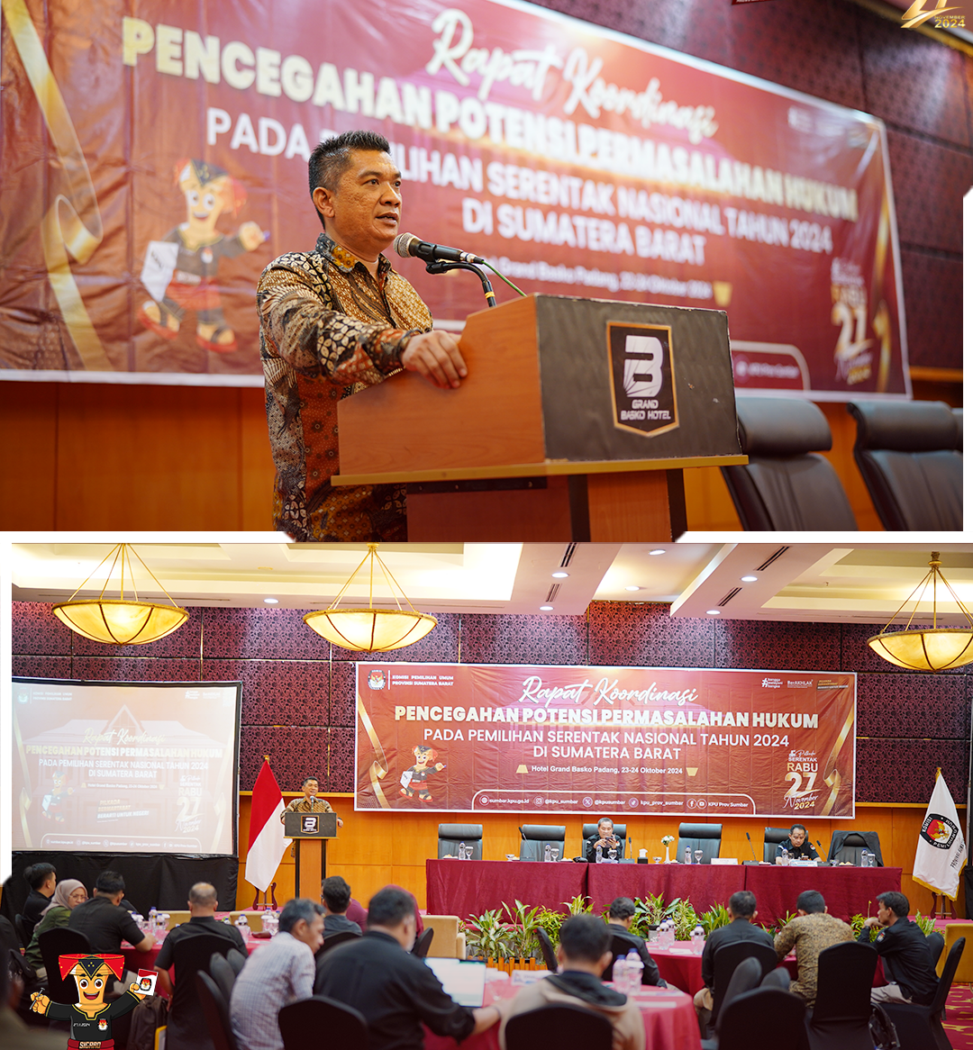 Padang.sumbar.kpu.go.id - Komisi Pemilihan Umum (KPU) Provinsi Sumatera Barat menggelar Rapat Koordinasi Pencegahan Potensi Permasalahan Hukum pada Pemilihan Serentak Nasional 2024. Acara ini diikuti oleh 110 peserta yang terdiri dari Ketua dan Anggota KPU Provinsi serta perwakilan KPU Kabupaten/Kota se-Sumatera Barat. Kegiatan bertujuan memperkuat kapasitas penyelenggara pemilu dalam mencegah dan menyelesaikan permasalahan hukum terkait Pemilihan Gubernur, Bupati, dan Wali Kota yang digelar serentak.