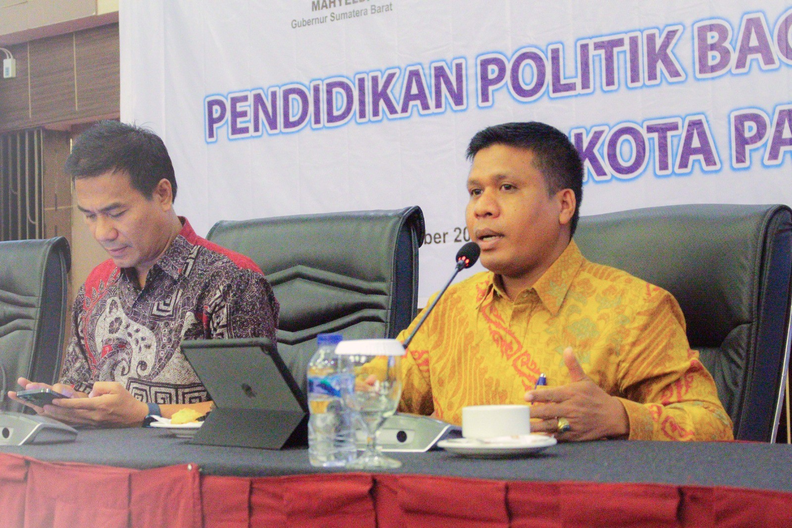 Padang-sumbar.kpu.go.id - Jons Manedi, Ketua Divisi Sosialisasi, Pendidikan Pemilih, Partisipasi Masyarakat dan SDM KPU Provinsi Sumatera barat menghadiri undangan dari Kesbangpol Provinsi Sumatera Barat sekaligus menjadi narasumber dalam kegiatan pendidikan politik bagi tokoh masyarakat Kota Padang. Peserta yang menghadiri berasal dari unsur masyarakat Kota Padang sebanyak 130 (seratus tiga puluh) orang.