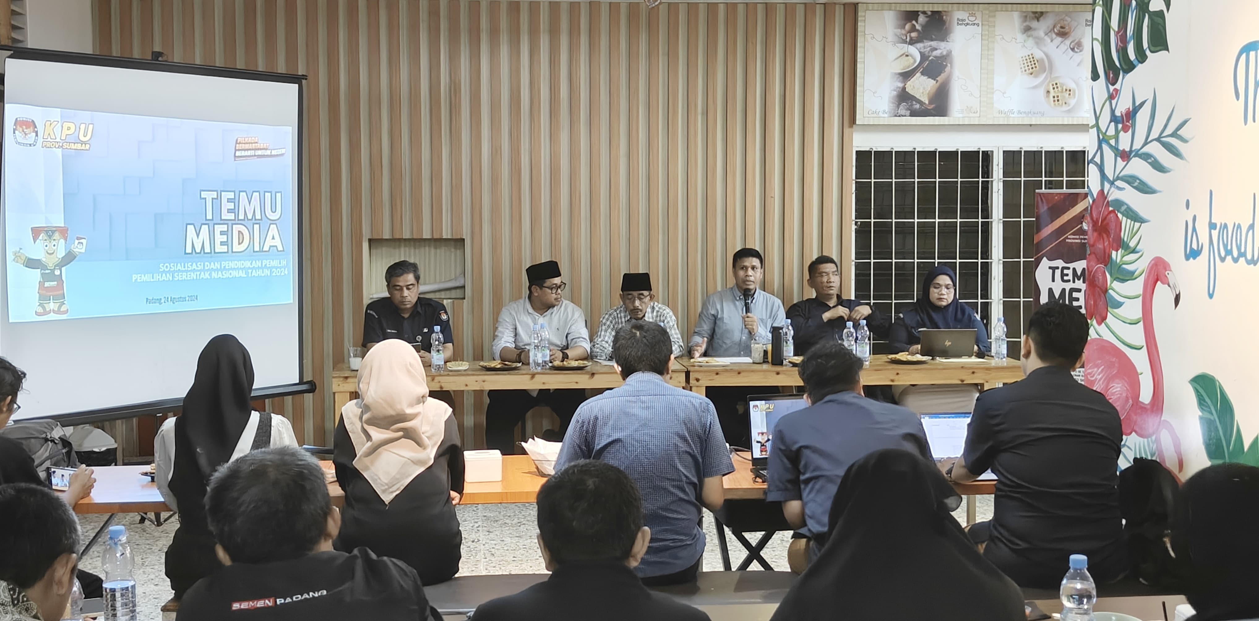 Temu media kali ini membahas tentang progres Daftar Pemilih Sementara (DPS) menuju Daftar Pemilih Tetap (DPT) dan informasi terkait Pendaftaran Pasangan Calon Kepala Daerah pada tanggal 27 s.d 29 Agustus 2024, dipimpin Ketua KPU Surya Efitrimen dan dihadiri anggota KPU Provinsi Sumatera Barat lainnya, Jons Manedi, Ory Sativa dan Hamdan.