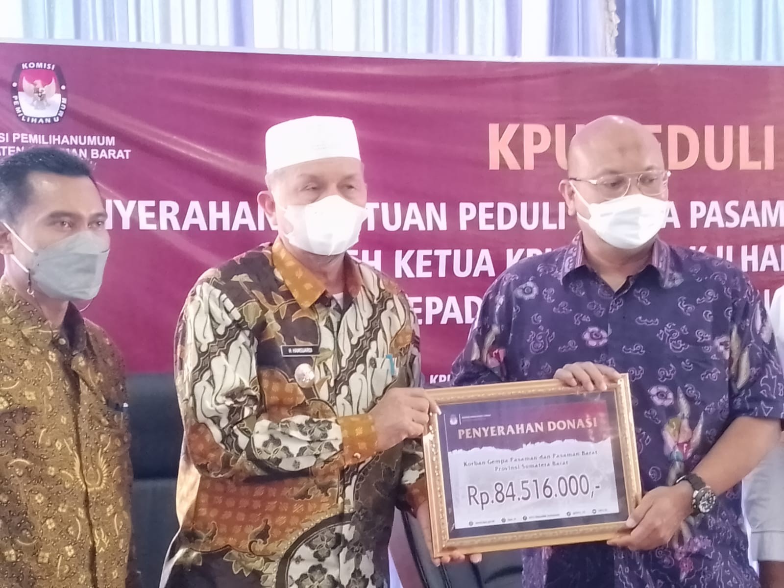 Ketua Komisi Pemilihan Umum (KPU) Republik Indonesia (RI) Ilham Saputra, menyerahkan bantuan sebesar Rp. 84.516.000 untuk korban terdampak bencana gempa di Pasaman dan Pasaman Barat. Bantuan secara simbolis diterima langsung Bupati Pasaman Barat (Pasbar) Hamsuardi yang didampingi Wakil Bupati Risnawanto di ruang balkon kantor bupati Pasaman Barat Kamis 7 April 2022.