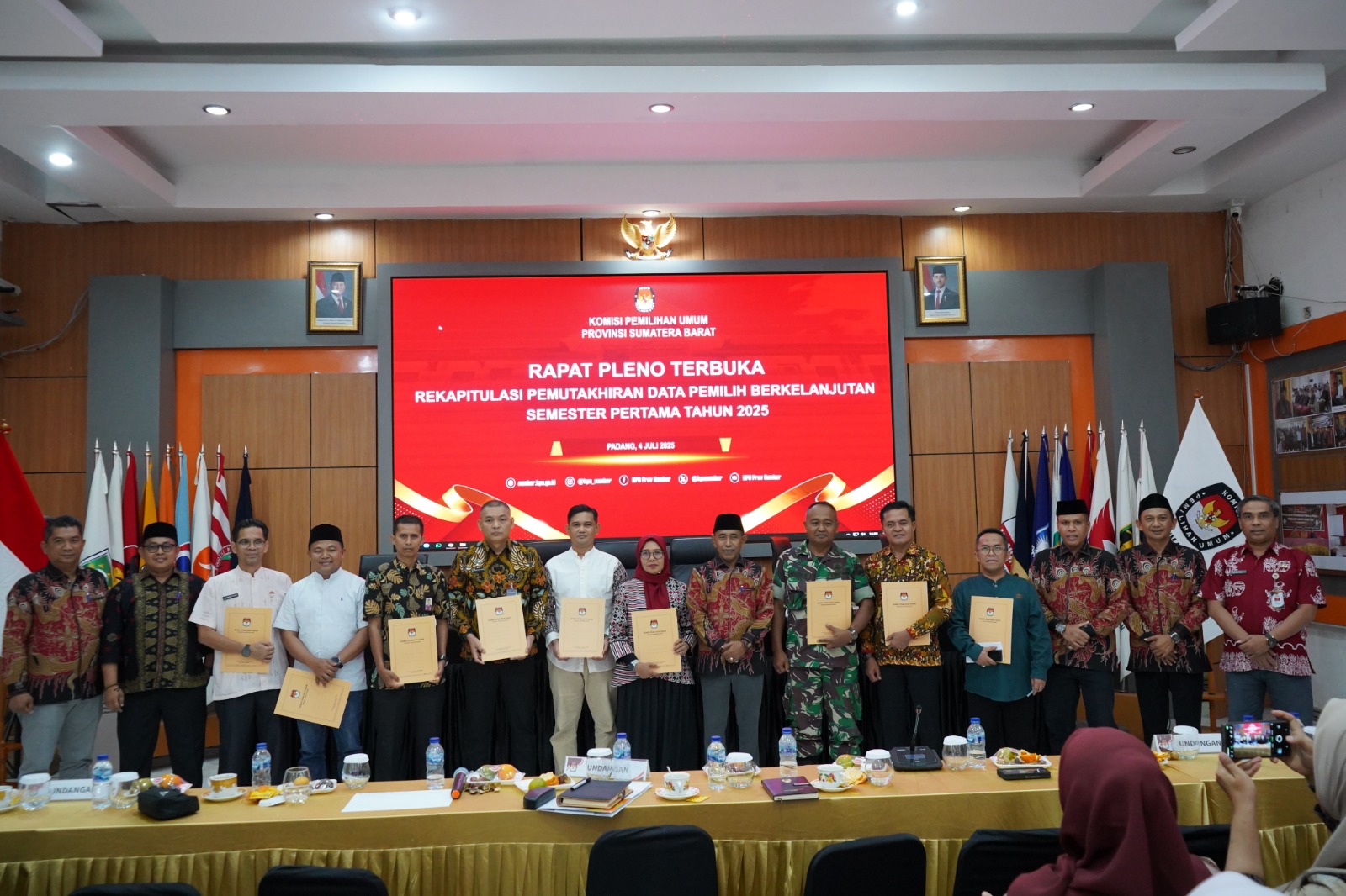 Rapat pleno ditutup pukul 16.06 WIB oleh Ketua KPU Provinsi Sumatera Barat dengan pembacaan hamdallah dan tiga ketukan palu. Sebelumnya, berita acara rapat ditandatangani seluruh anggota KPU sebagai penegasan hasil rekapitulasi PDPB Semester Pertama 2025. (Maidi/Parhumas KPU Sumbar)