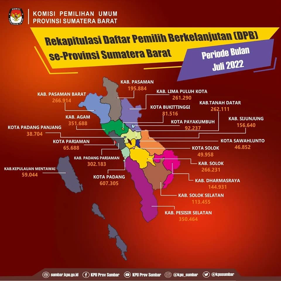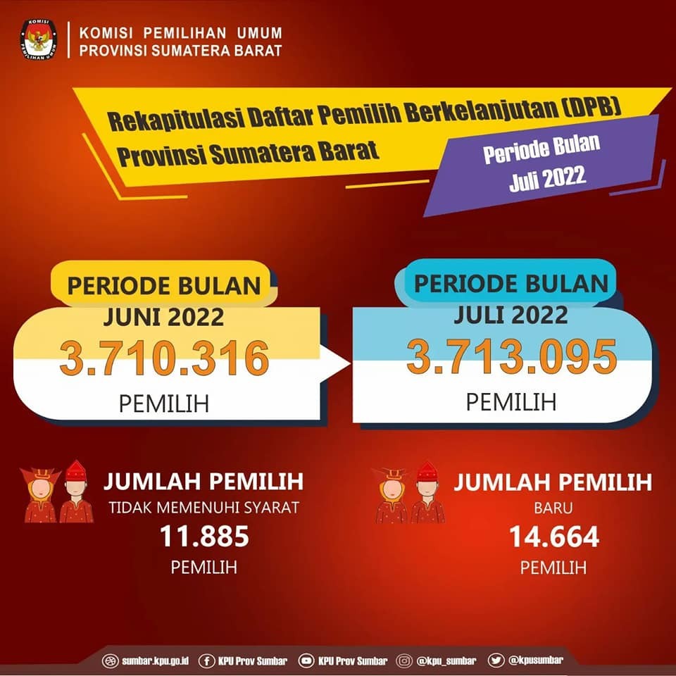 Padang, sumbar.kpu.go.id,- Komisi Pemilihan Umum Provinsi Sumatera Barat (KPU Sumbar) umumkan rekapitulasi Daftar Pemilih Berkelanjutan (DPB) bulan Juli 2022 sebanyak 3.713.095 pemilih yang tersebar di 19 kabupaten/kota, 179 kecamatan dan 1.158 desa/kelurahan/nagari di Sumbar. Ketua Divisi Data dan Informasi KPU Sumbar, Yuzalmon, menerangkan bahwa terdapat penambahan jumlah pemilih dari DPB sebelumnya, dimana DPB bulan Juni 2022 berjumlah 3.710.316 pemilih.