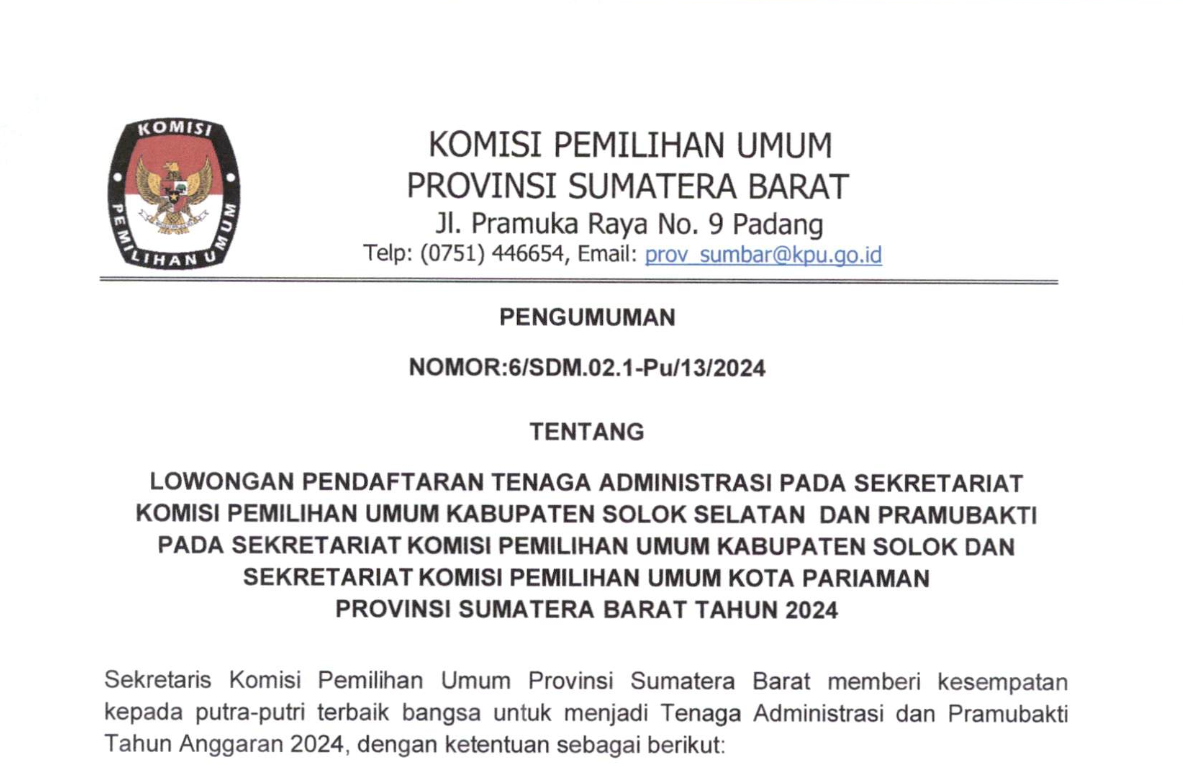 LOWONGAN PENDAFTARAN TENAGA ADMINISTRASI PADA SEKRETARIAT KPU KABUPATEN SOLOK SELATAN DAN PRAMUBAKTI PADA SEKRETARIAT KPU KABUPATEN SOLOK DAN KPU KOTA PARIAMAN TAHUN 2024 Senin, 26 Februari 2024 00:00 1163 PENGUMUMAN Bagikan: Dilihat 1,163 Kali.