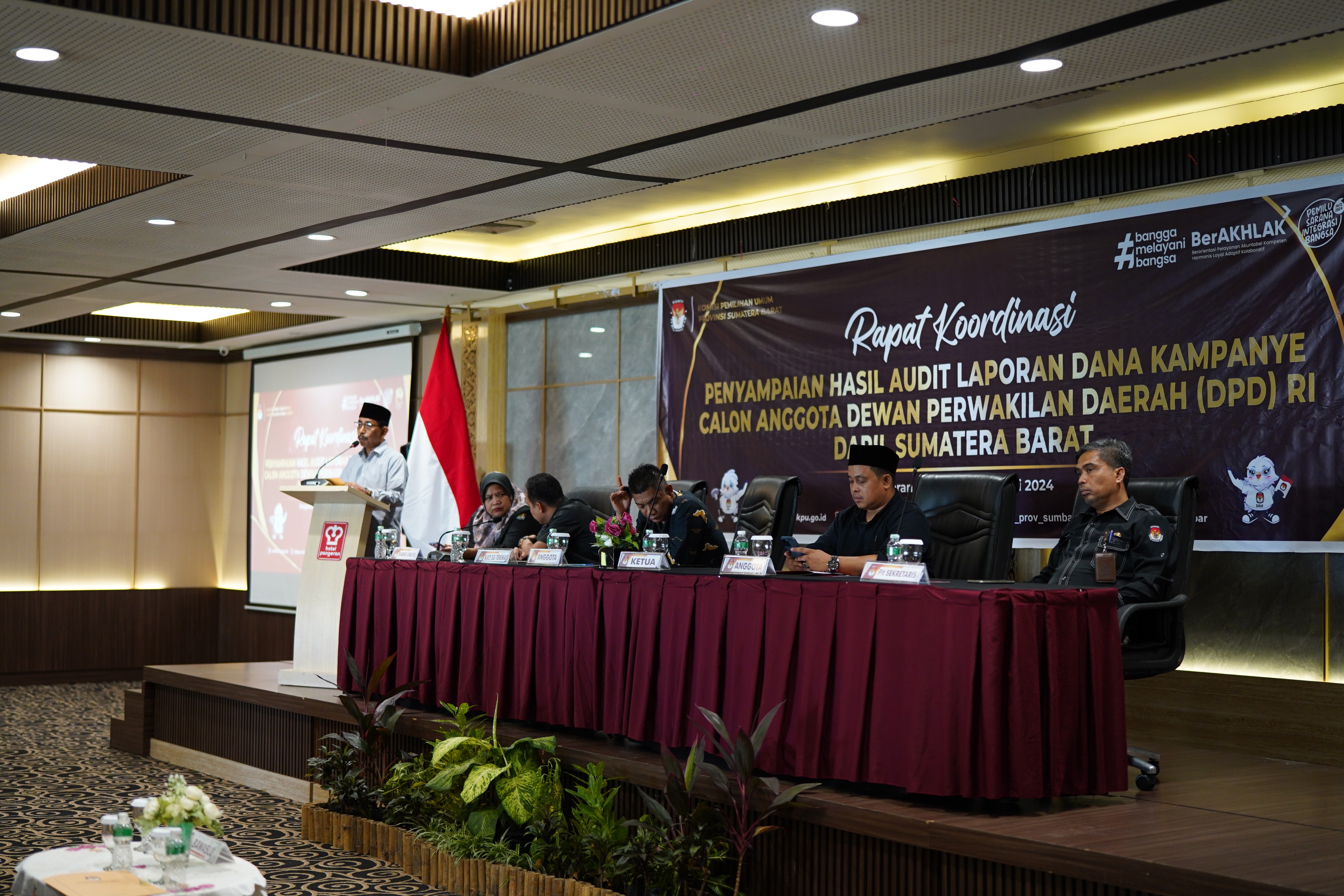 Padang-sumbar.kpu.go.id - Komisi Pemilihan Umum Provinsi Sumatera Barat menggelar Rapat Koordinasi Penyampaian Audit Laporan Dana Kampanye calon anggota DPD RI Dapil Sumatera Barat pada hari Rabu (5/6/2024) di Hotel Pangeran Beach. Acara ini dihadiri oleh para calon DPD, Liaison Officer (LO), Operator calon anggota DPD RI Dapil Sumatera Barat Pemilu 2024, serta Bawaslu Provinsi Sumatera Barat.