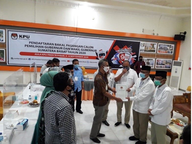 sumbar.kpu.go.id | Padang,—Pasangan Calon (Paslon) yang diusung partai Gerindra (14 Kursi), Nasrul Abit dan Indra Catri melakukan pendaftaran Calon Gubernur-Wakil Gubernur ke KPU Sumbar pada hari kedua (Sabtu, 5/9/2020). Datang diantar Ketua Parpol Pengusung Partai Gerindra Andre Rosiade dan Sekretaris Evi Yandri Rajo Budiman. “Persyaratan yang diajukan pasangan Nasrul Abit dan Indra Catri, diterima dan dinyatakan lengkap,”ujar Ketua Divisi Teknis Penyelenggaraan Pemilu Izwaryani yang memimpin penerimaan dan pemeriksaan berkas pendaftaran Bapaslon Nasrul Abit dan Indra Catri. Menurut Izwaryani kelengkapan berkas yang diperiksa oleh tim verifikator KPU dianggap memenuhi syarat, untuk syarat pencalonan di antaranya adalah formulir Model B (Surat Pencalonan), Model B1-KWK (Keputusan Pimpinan Parpol Tingkat Pusat Tentang Persetujuan Bapaslon), dan salinan SK kepengurusan tingkat provinsi serta Model BB1 (Syarat Calon), yang sah dan lengkap.