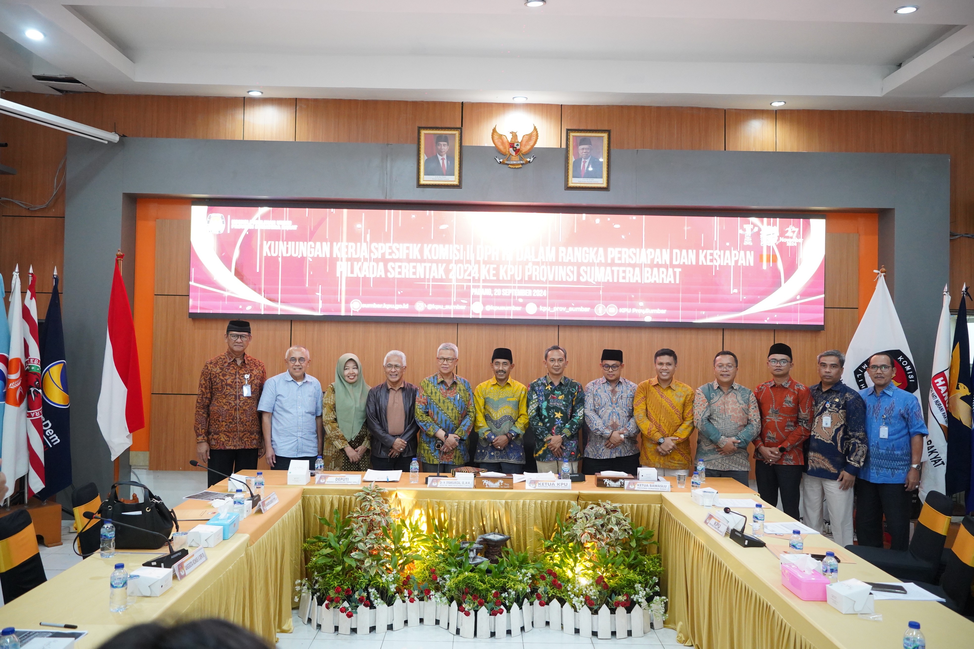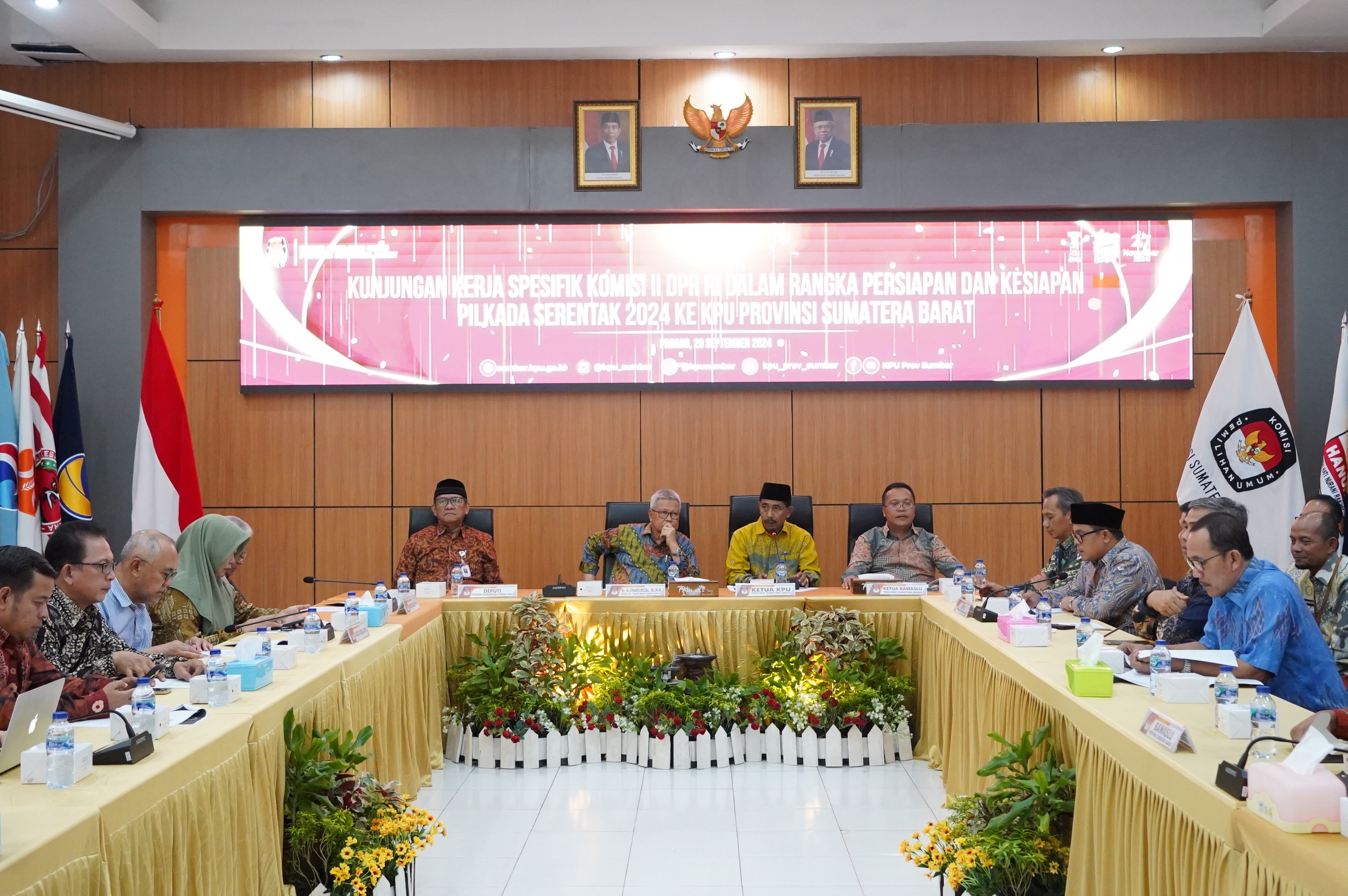Padang, 20 September 2024 – Komisi II DPR RI menggelar kunjungan kerja spesifik ke Komisi Pemilihan Umum (KPU) Provinsi Sumatera Barat dalam rangka memantau persiapan dan kesiapan penyelenggaraan Pilkada Serentak 2024. Kegiatan ini berlangsung di Aula KPU Provinsi Sumatera Barat dan dihadiri oleh jajaran KPU RI, Ketua dan Anggota Komisi II DPR RI, serta pimpinan KPU dan Bawaslu Provinsi Sumatera Barat.