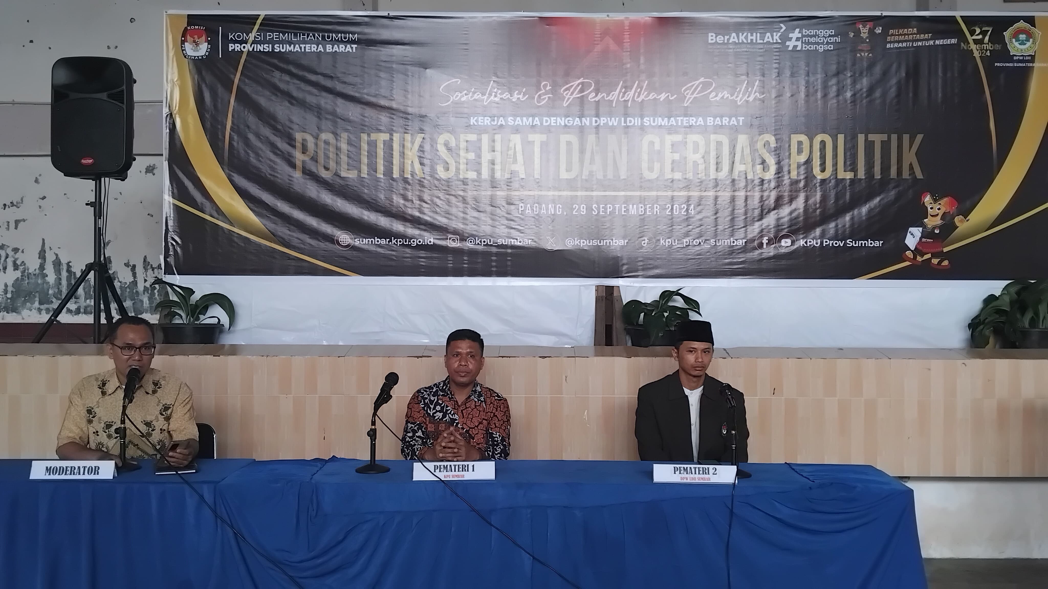 Padang, 29 September 2024 – Komisi Pemilihan Umum (KPU) Provinsi Sumatera Barat menggelar sosialisasi pendidikan pemilih dalam rangka mempersiapkan Pemilihan Gubernur dan Wakil Gubernur Sumatera Barat tahun 2024. Acara ini bertujuan mengedukasi masyarakat tentang pentingnya menjadi pemilih cerdas dan menolak politik uang. Sosialisasi ini diadakan oleh Lembaga Dakwah Islam Indonesia (LDII) Provinsi Sumatera Barat pada Minggu, 29 September 2024, di Pondok Pesantren Miftahul Jannah, Padang.