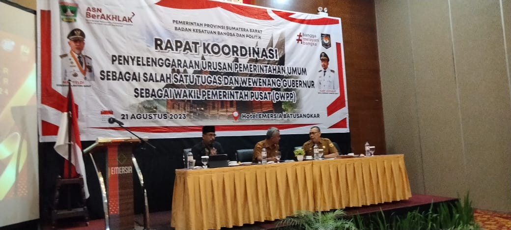 Ketua KPU Provinsi Sumatera Barat, Surya Efitrimen menyampaikan pernyataan dihadapan peserta Rapat Koordinasi Penyelenggaraan Pemerintahan Umum sebagai salah satu tugas wewenang Gubernur sebagai Wakil Pemerintah Pusat (GWPP) sebanyak 80 orang yang terdiri dari Kepala Kesbangpol Provinsi dan Kabupaten/Kota se-Sumatera Barat, Biro Pemerintahan dan Otda Setda Provinsi Sumatera Barat, Biro Organisasi Setda Provinsi Sumatera Barat, Kepala Bagian Pemerintahan Kabupaten/Kota se-Sumatera Barat dan Pejabat Eselon III dan IV Kesbangpol Provinsi dan Kab/Kota se-Sumatera Barat bertempat di Hotel Emersia, Batusangkar, Senin, 21 Agustus 2023.