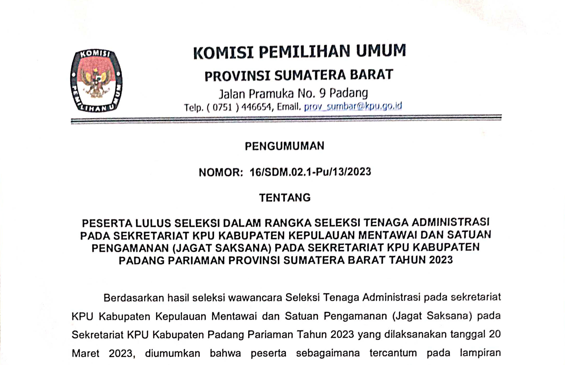 PENGUMUMAN NOMOR: 16/SDM.02.1-Pu/13/2023 TENTANG PESERTA LULUS SELEKSI TENAGA ADMINISTRASI PADA SEKRETARIAT KPU KABUPATEN KEPULAUAN MENTAWAI DAN SATUAN PENGAMANAN (JAGAT SAKSANA) PADA SEKRETARIAT KPU KABUPATEN PADANG PARIAMAN PROVINSI SUMATERA BARAT TAHUN 2023