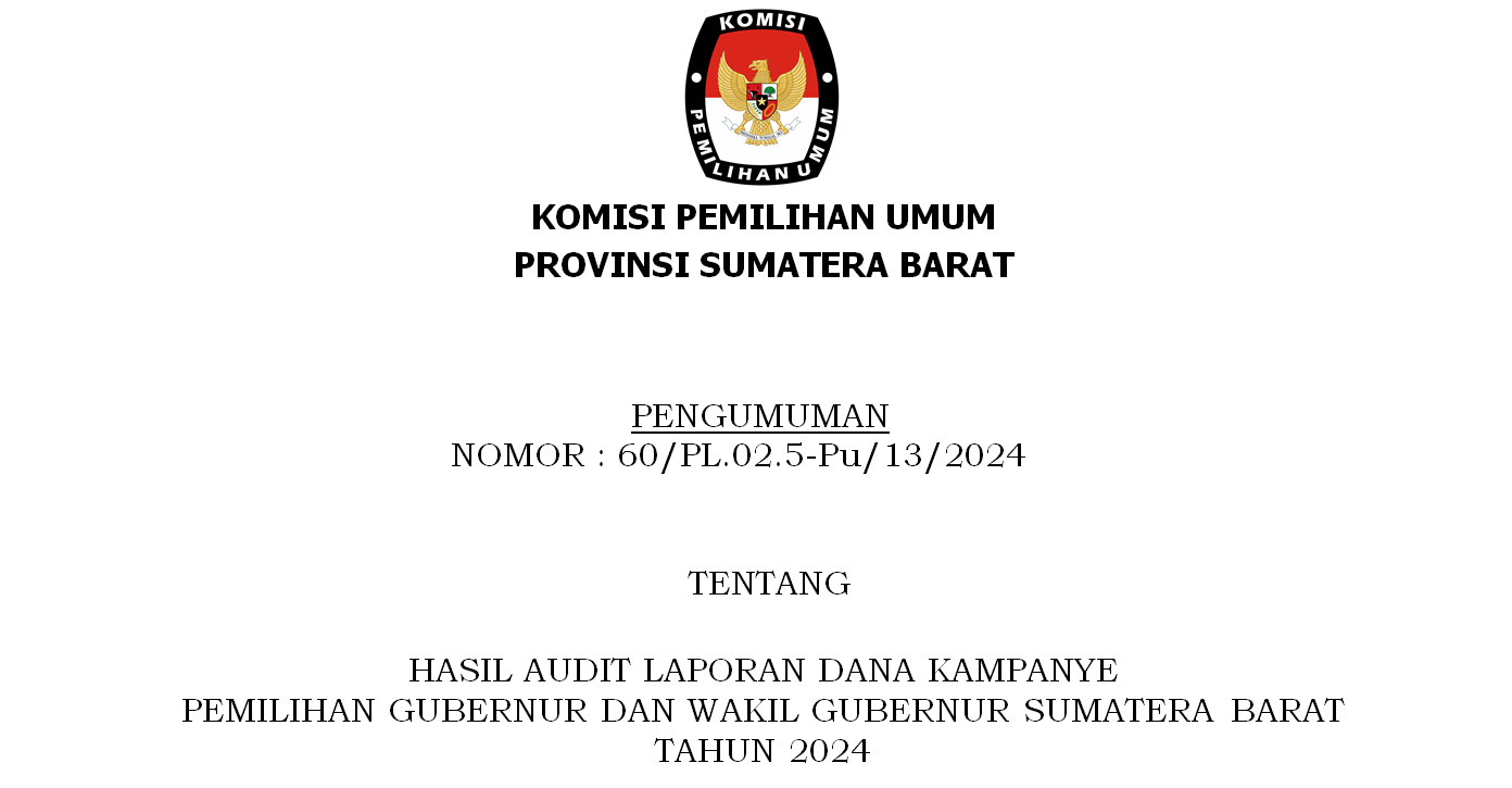 Pengumuman Hasil Audit Laporan Dana Kampanye Paslon Gubernur dan Wakil Gubernur Sumatera Barat Tahun 2024