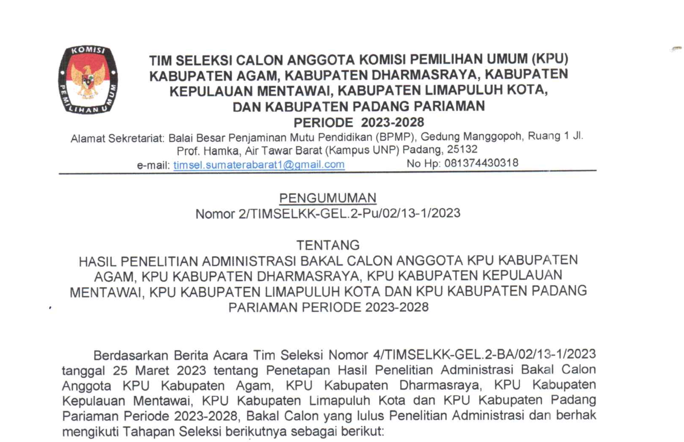 PENGUMUMAN NOMOR : 2/TIMSELKK-GEL2-Pu/01/13/2023 TENTANG HASIL PENELITIAN ADMINISTRASI BAKAL CALON ANGGOTA KOMISI PEMILIHAN UMUM KABUPATEN AGAM, KABUPATEN DHARMASRAYA, KABUPATEN KEPULAUAN MENTAWAI, KABUPATEN LIMA PULUH KOTA DAN KABUPATEN PADANG PARIAMAN PERIODE 2023-2028