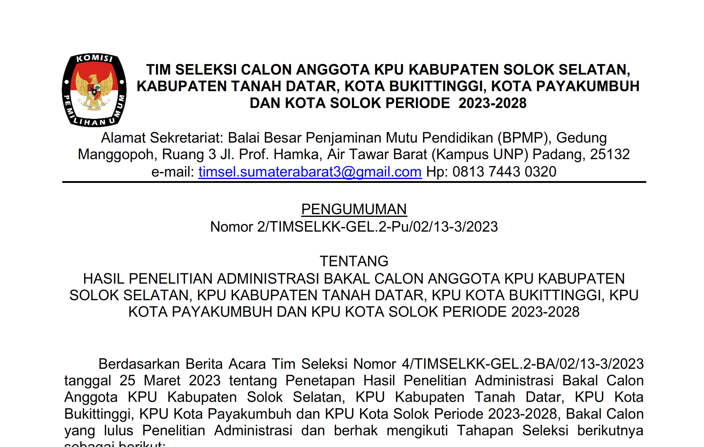 PENGUMUMAN Nomor 2/TIMSELKK-GEL.2-Pu/02/13-3/2023 TENTANG HASIL PENELITIAN ADMINISTRASI BAKAL CALON ANGGOTA KPU KABUPATEN SOLOK SELATAN, KPU KABUPATEN TANAH DATAR, KPU KOTA BUKITTINGGI, KPU KOTA PAYAKUMBUH DAN KPU KOTA SOLOK PERIODE 2023-2028
