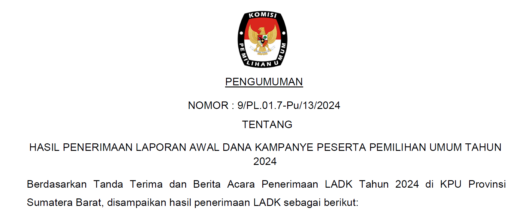 PENGUMUMAN HASIL PENERIMAAN LAPORAN AWAL DANA KAMPANYE (LADK) PESERTA PEMILU TAHUN 2024