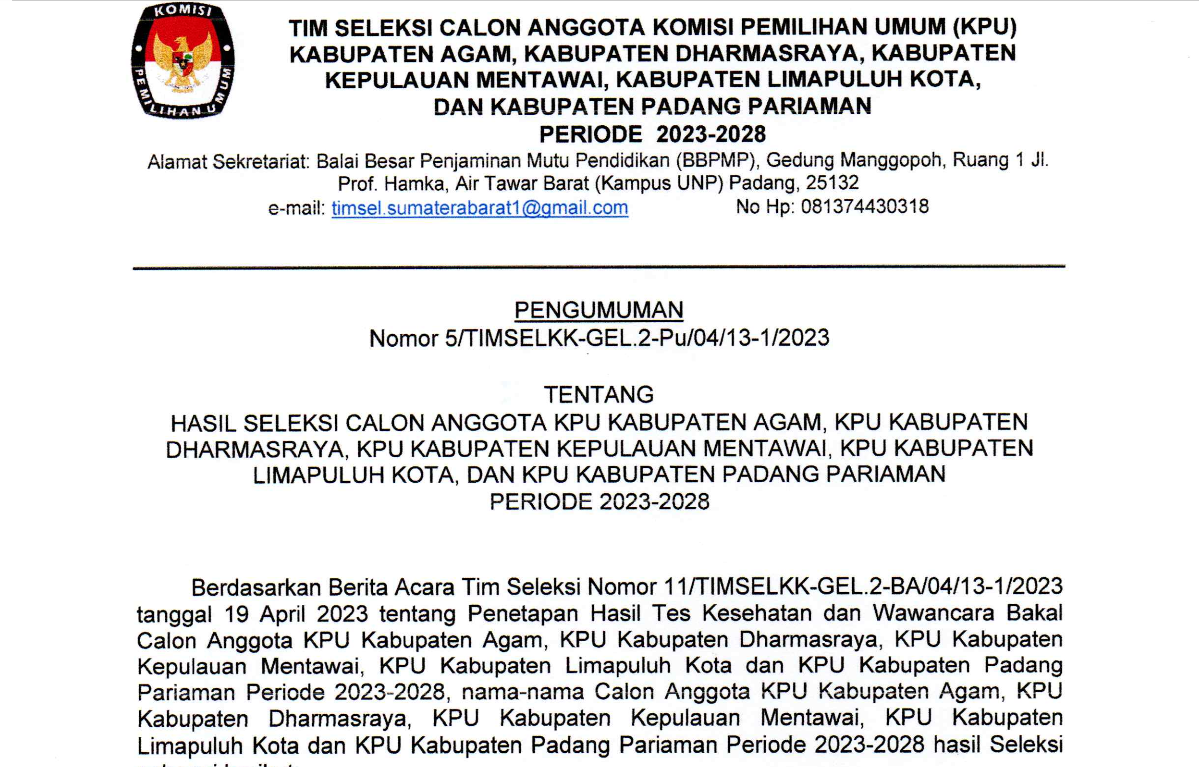 PENGUMUMAN NOMOR : 5/TIMSELKK-GEL2-Pu/04/13/2023 TENTANG HASIL SELEKSI CALON ANGGOTA KOMISI PEMILIHAN UMUM KABUPATEN AGAM, KABUPATEN DHARMASRAYA, KABUPATEN KEPULAUAN MENTAWAI, KABUPATEN LIMA PULUH KOTA DAN KABUPATEN PADANG PARIAMAN PERIODE 2023-2028