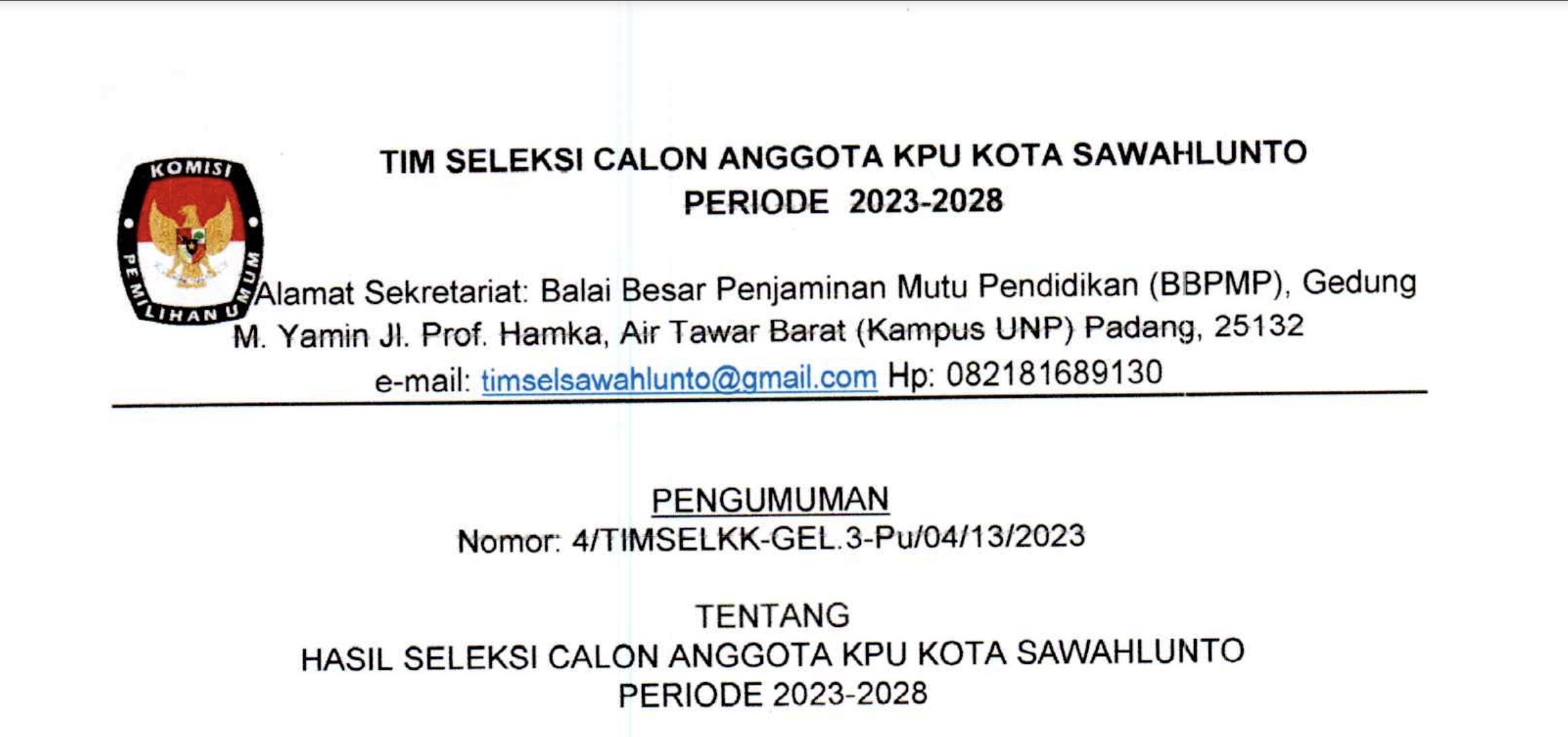Pengumuman Tim Seleksi Calon Anggota KPU Kota Sawahlunto Nomor: 4/TIMSELKK-GEL3-Pu/04/13/2023 tentang Hasil Seleksi Calon Anggota KPU Kota Sawahlunto Periode 2023-2028