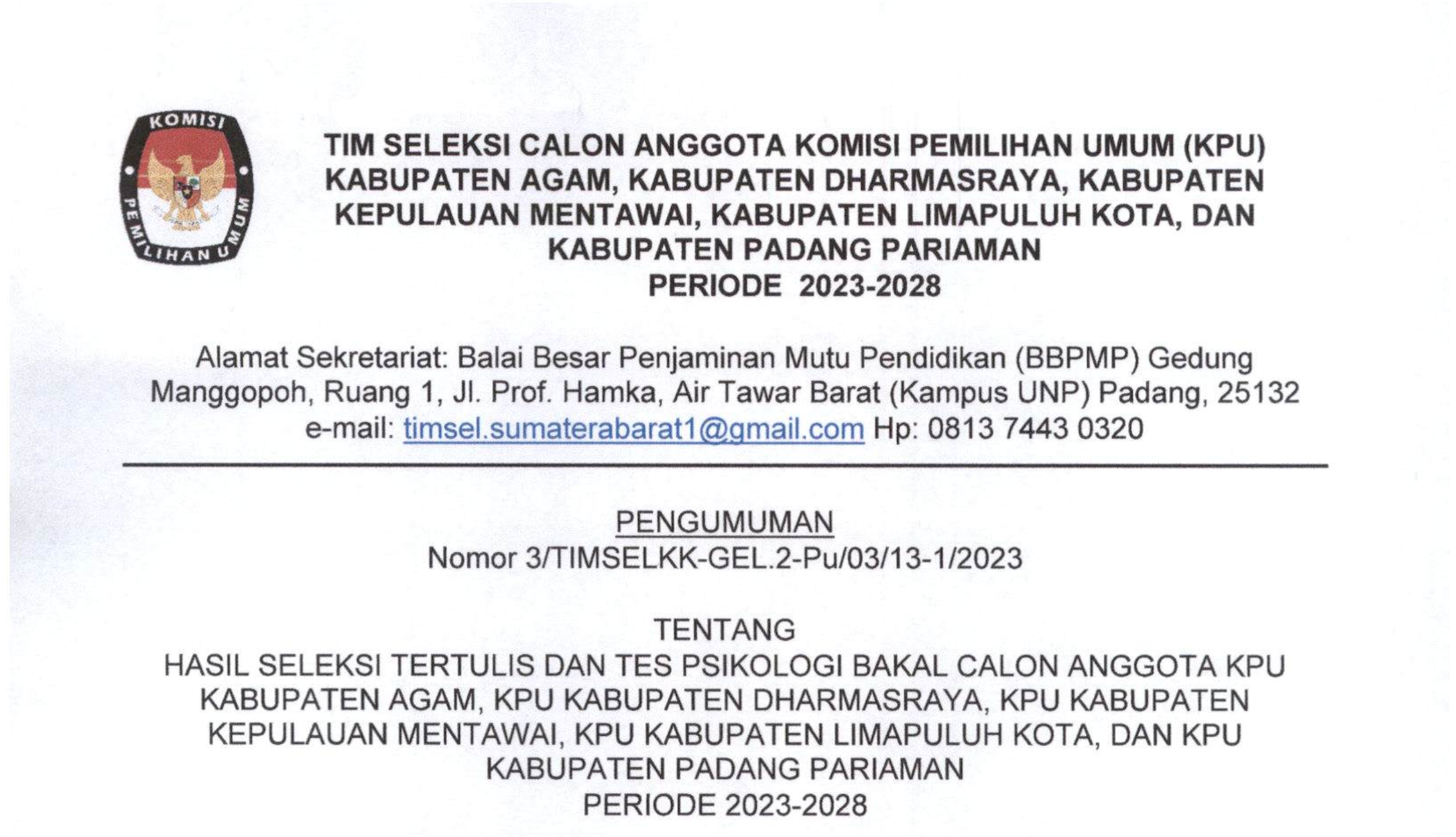 PENGUMUMAN NOMOR : 3/TIMSELKK-GEL2-Pu/03/13/2023 TENTANG HASIL SELEKSI TERTULIS DAN PSIKOLOGI BAKAL CALON ANGGOTA KOMISI PEMILIHAN UMUM KABUPATEN AGAM, KABUPATEN DHARMASRAYA, KABUPATEN KEPULAUAN MENTAWAI, KABUPATEN LIMA PULUH KOTA DAN KABUPATEN PADANG PARIAMAN PERIODE 2023-2028