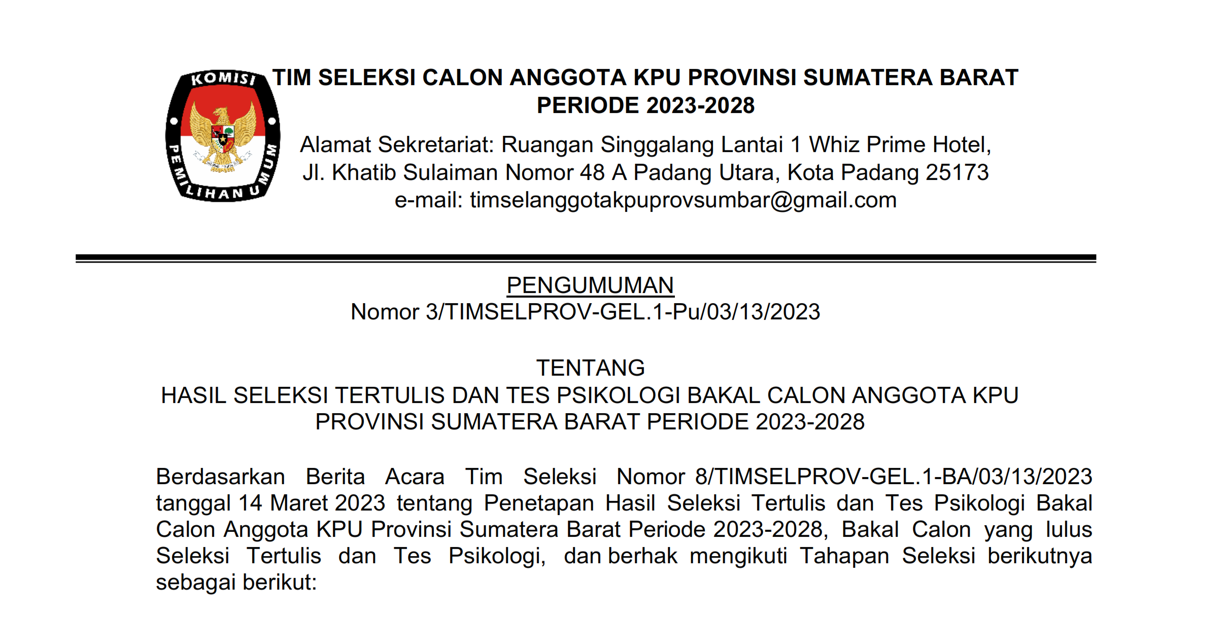 PENGUMUMAN HASIL SELEKSI TERTULIS DAN TES PSIKOLOGI BAKAL CALON ANGGOTA KPU PROVINSI SUMATERA BARAT PERIODE 2023-2028