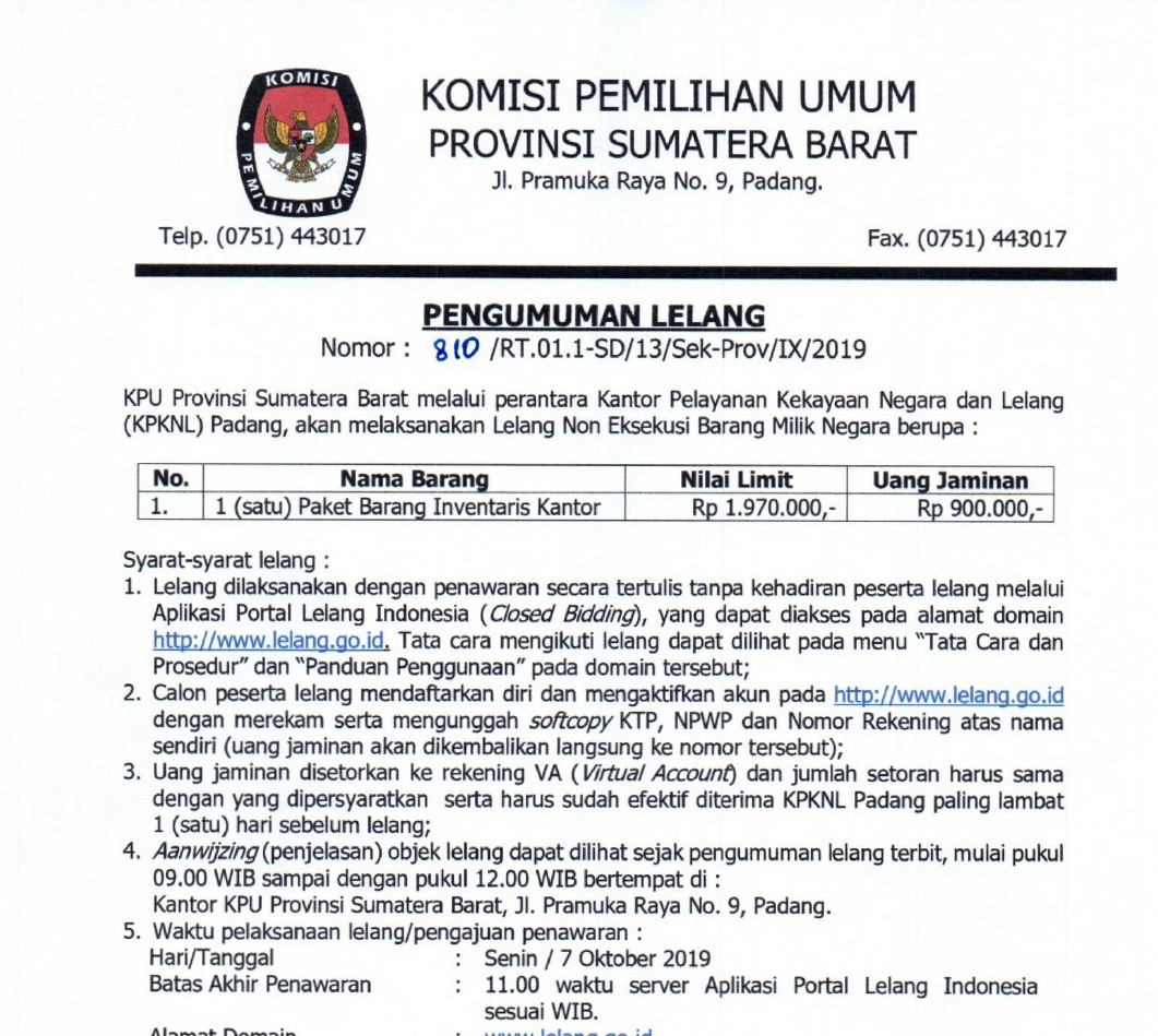 Pengumuman lelang No : 810/RT.01.1-SD/13/Sek-Prof/IX/2019 Selasa, 01 Oktober 2019 17:00 14 Pengumuman lelang No : 810/RT.01.1-SD/13/Sek-Prof/IX/2019 lihat disini Bagikan: Dilihat 14 Kali.