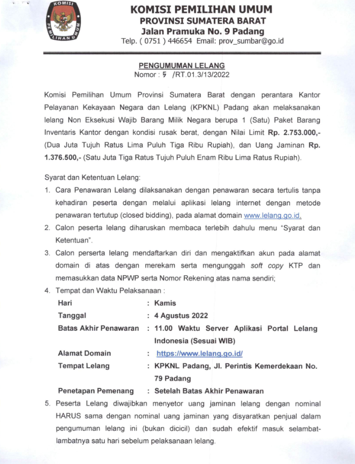 PENGUMUMAN LELANG NOMOR 5/RT.01.3/13/2022. Kamis, 28 Juli 2022 00:00 110 PENGUMUMAN LELANG NOMOR 5/RT.01.3/13/2022. LIHAT DISINI Bagikan: Dilihat 110 Kali.