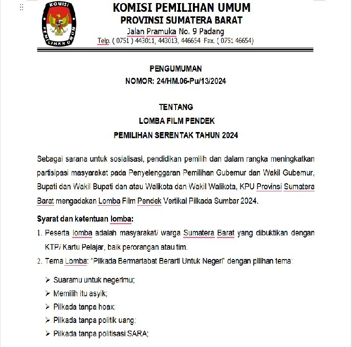 PENGUMUMAN LOMBA FILM PNDEK PEMILIHAN SERENTAK TAHUN 2024 Jumat, 13 September 2024 07:00 109 https://sumbar.kpu.go.id/dmdocument/1726211225Pengumuman Lomba (1).doc Bagikan: Dilihat 109 Kali.