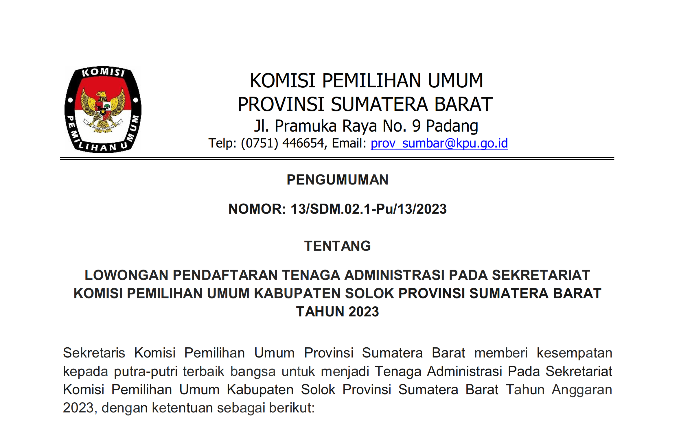 PENGUMUMAN NOMOR: 13/SDM.02.1-Pu/13/2023 TENTANG LOWONGAN PENDAFTARAN TENAGA ADMINISTRASI PADA SEKRETARIAT KOMISI PEMILIHAN UMUM KABUPATEN SOLOK PROVINSI SUMATERA BARAT TAHUN 2023