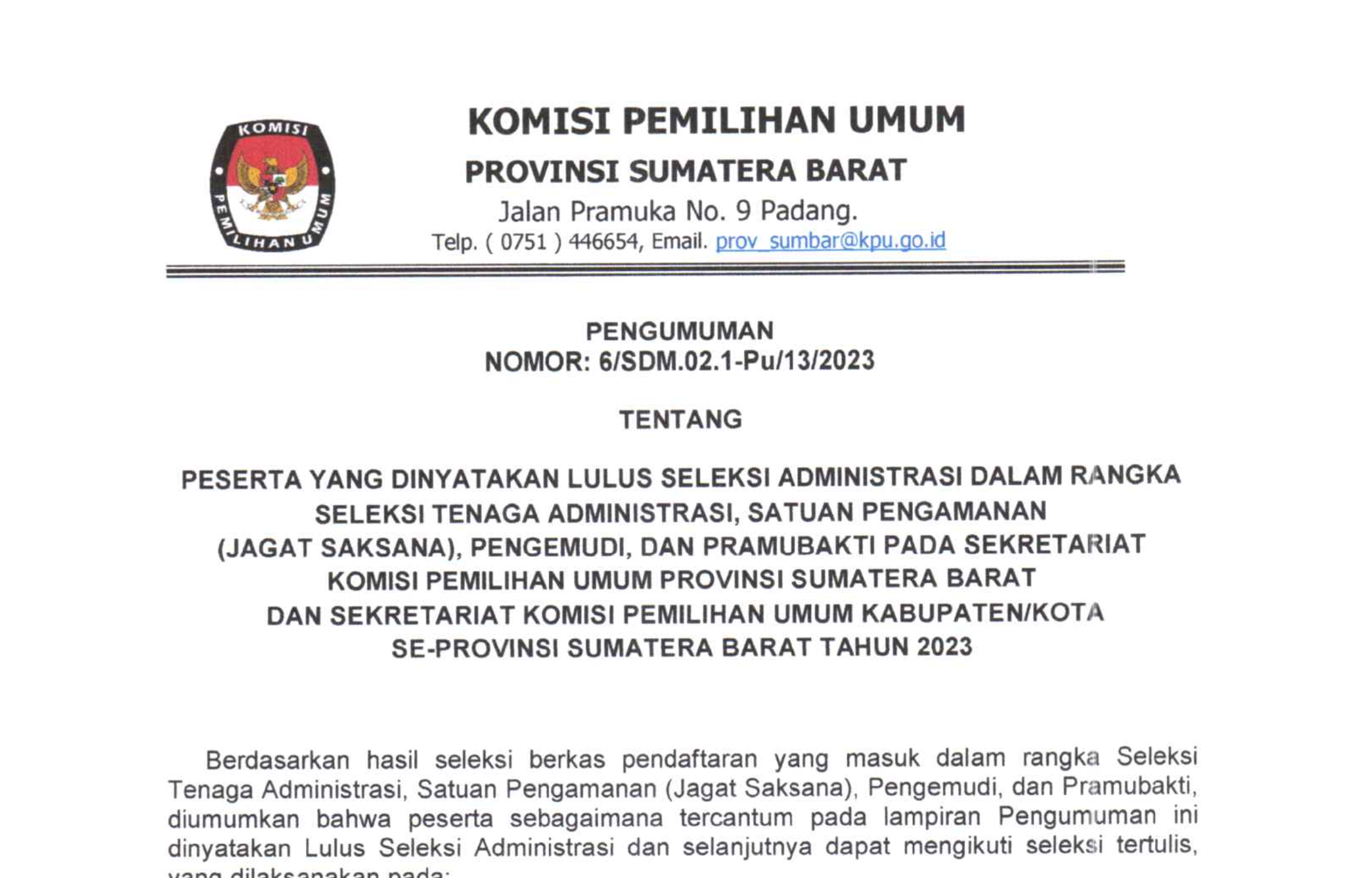 PENGUMUMAN NOMOR: 6/SDM.02.1-Pu/13/2023 TENTANG PESERTA YANG DINYATAKAN LULUS SELEKSI ADMINISTRASI DALAM RANGKA SELEKSI TENAGA ADMINISTRASI, SATUAN PENGAMANAN (JAGAT SAKSANA), PENGEMUDI, DAN PRAMUBAKTI PADA SEKRETARIAT KOMISI PEMILIHAN UMUM PROVINSI SUMATERA BARAT DAN SEKRETARIAT KOMISI PEMILIHAN UMUM KABUPATEN/KOTA SE-PROVINSI SUMATERA BARAT TAHUN 2023