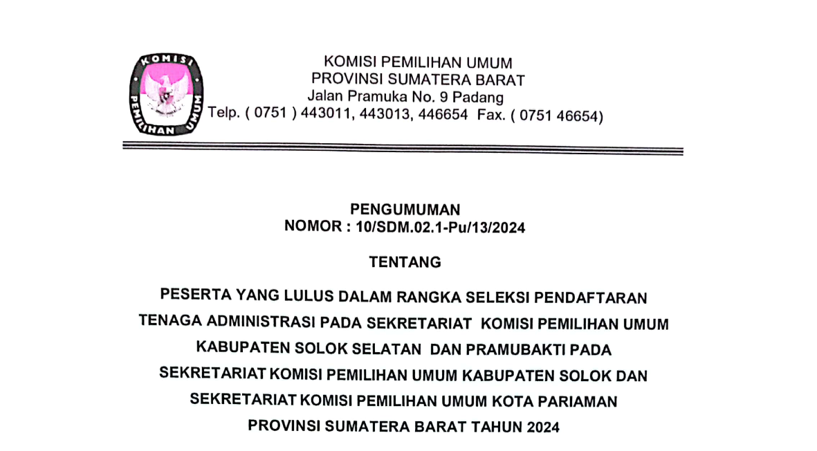 PENGUMUMAN LULUS SELEKSI PENDAFTARAN TENAGA ADM SEKRETARIAT KPU KAB. SOLOK SELATAN & PRAMUBAKTI SEKRETARIAT KPU KAB. SOLOK & KPU KOTA PARIAMAN TAHUN 2024 Jumat, 08 Maret 2024 00:00 313 PENGUMUMAN Bagikan: Dilihat 313 Kali.