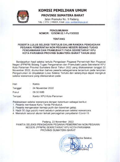 PENGUMUMAN LULUS SELEKSI TERTULIS PENGADAAN PEGAWAI PEMERINTAH NON PEGAWAI NEGERI (PPNPN) SEKRETARIAT KPU KOTA PARIAMAN PROVINSI SUMATERA BARAT TAHUN 2022