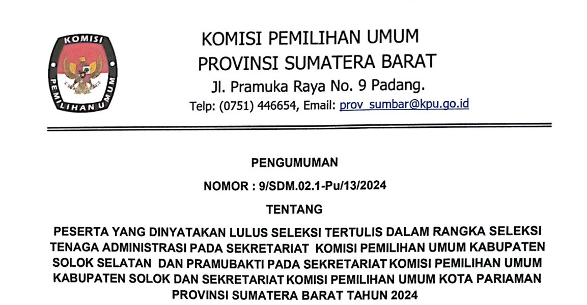 PENGUMUMAN LULUS SELEKSI TERTULIS SELEKSI TENAGA ADM SEKRETARIAT KPU KAB. SOLOK SELATAN & PRAMUBAKTI SEKRETARIAT KPU KAB. SOLOK & KPU KOTA PARIAMAN TAHUN 2024 Selasa, 05 Maret 2024 00:00 224 PENGUMUMAN Bagikan: Dilihat 224 Kali.