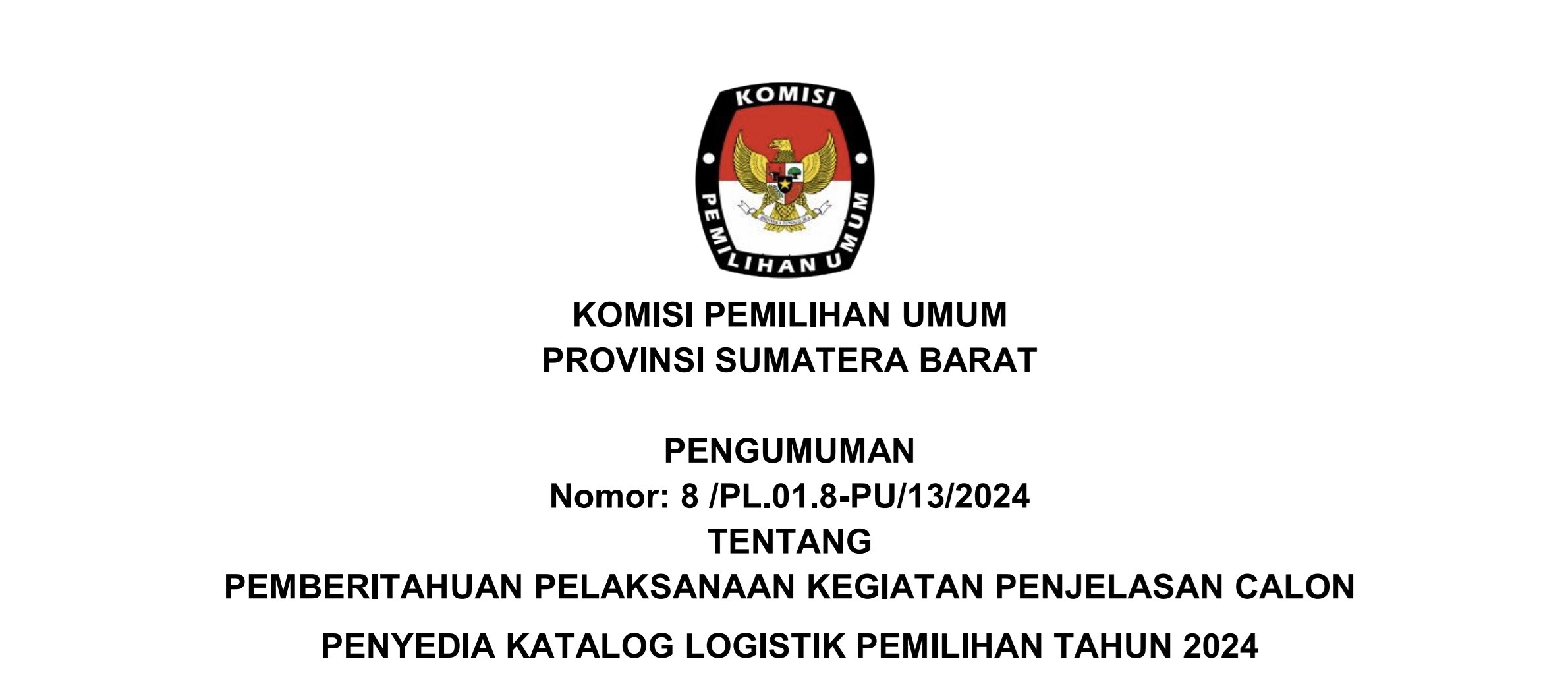 PENGUMUMAN Nomor: 8 /PL.01.8-PU/13/2024 TENTANG PEMBERITAHUAN PELAKSANAAN KEGIATAN PENJELASAN CALON PENYEDIA KATALOG LOGISTIK PEMILIHAN TAHUN 2024