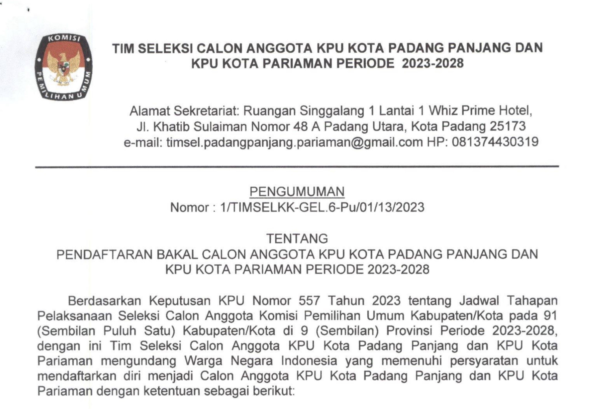 PENGUMUMAN NOMOR 1/TIMSELKK-GEL.6-Pu/01/13/2023 TENTANG PENDAFTARAN BAKAL CALON ANGGOTA KPU KOTA PADANG PANJANG DAN KPU KOTA PARIAMAN PERIODE 2023-2028