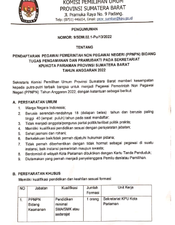 PENGUMUMAN PENDAFTARAN PEGAWAI PEMERINTAH NON PEGAWAI NEGERI (PPNPN) TUGAS PENGAMANAN DAN PRAMUBAKTI SEKRETARIAT KPU KOTA PARIAMAN PROVINSI SUMATERA BARAT