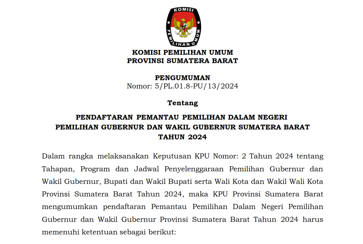 PENGUMUMAN PENDAFTARAN PEMANTAU PEMILIHAN DALAM NEGERI PEMILIHAN GUBERNUR DAN WAKIL GUBERNUR SUMATERA BARAT TAHUN 2024 Selasa, 27 Februari 2024 00:00 589 PENGUMUMAN Bagikan: Dilihat 589 Kali.
