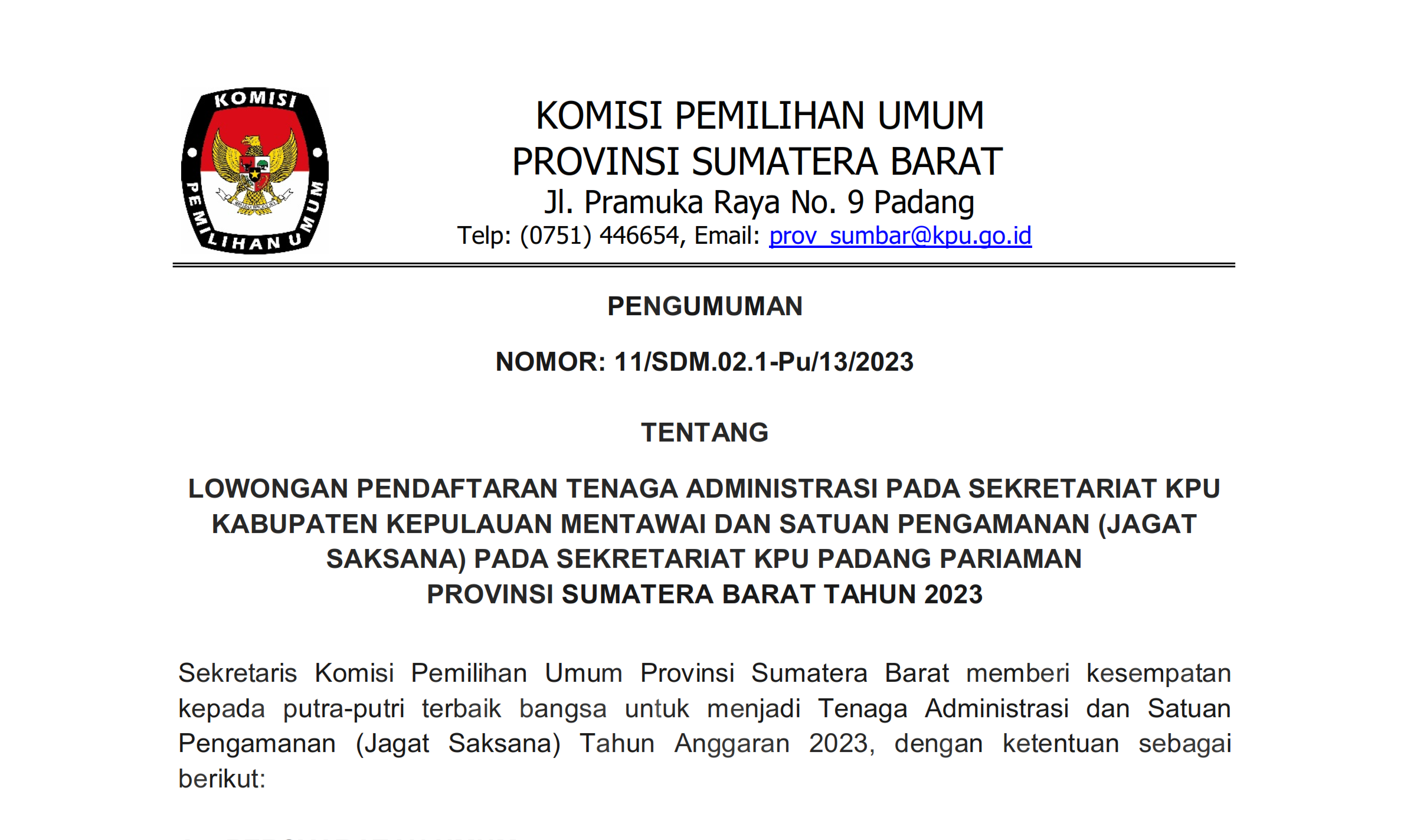 PENGUMUMAN NOMOR: 11/SDM.02.1-Pu/13/2023 TENTANG LOWONGAN PENDAFTARAN TENAGA ADMINISTRASI PADA SEKRETARIAT KPU KABUPATEN KEPULAUAN MENTAWAI DAN SATUAN PENGAMANAN (JAGAT SAKSANA) PADA SEKRETARIAT KPU PADANG PARIAMAN PROVINSI SUMATERA BARAT TAHUN 2023