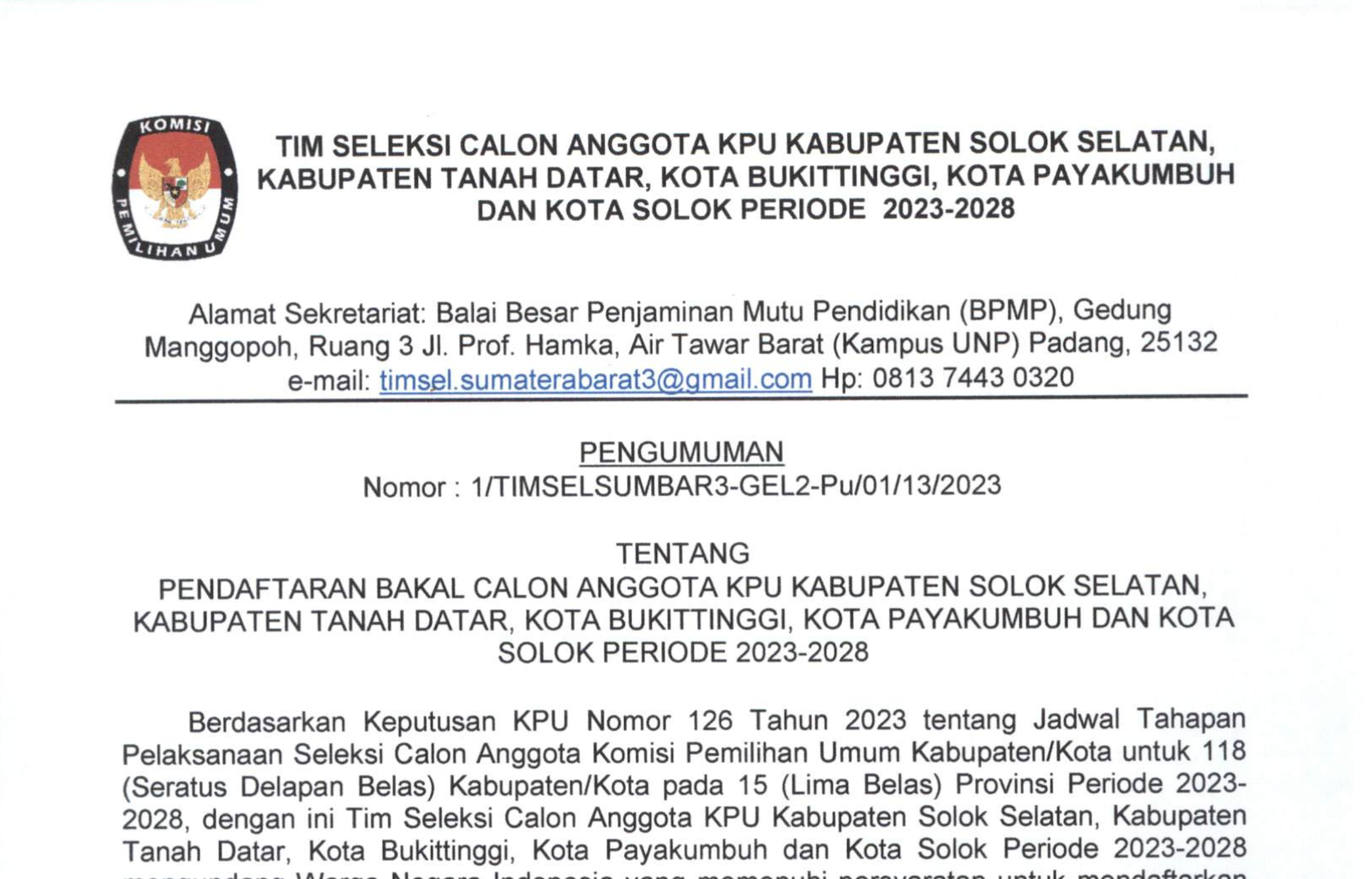 PENGUMUMAN NOMOR : 1/TIMSELSUMBAR3-GEL2-Pu/01/13/2023 TENTANG PENDAFTARN BAKAL CALON ANGGOTA KPU KABUPATEN SOLOK SELATAN, KABUPATEN TANAH DATAR, KOTA BUKITTINGGI, KOTA PAYAKUMBUH DAN KOTA SOLOK PERIODE 2023-2028