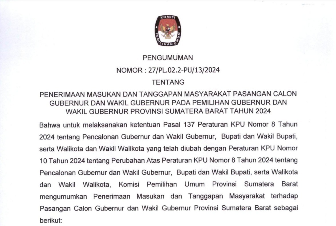 PENGUMUMAN PENERIMAAN MASUKAN DAN TANGGAPAN MASYARAKAT PASANGAN CALON GUBERNUR DAN WAKIL GUBERNUR PADA PEMILIHAN GUBERNUR DAN WAKIL GUBERNUR SUMATERA BARAT TAHUN 2024 Jumat, 13 September 2024 13:50 323 https://sumbar.kpu.go.id/dmdocument/172623462127_Pengumuman Hasil Adm Calon Gubernur dan Wakil Gubernur Sumbar 2024.pdf Bagikan: Dilihat 323 Kali.