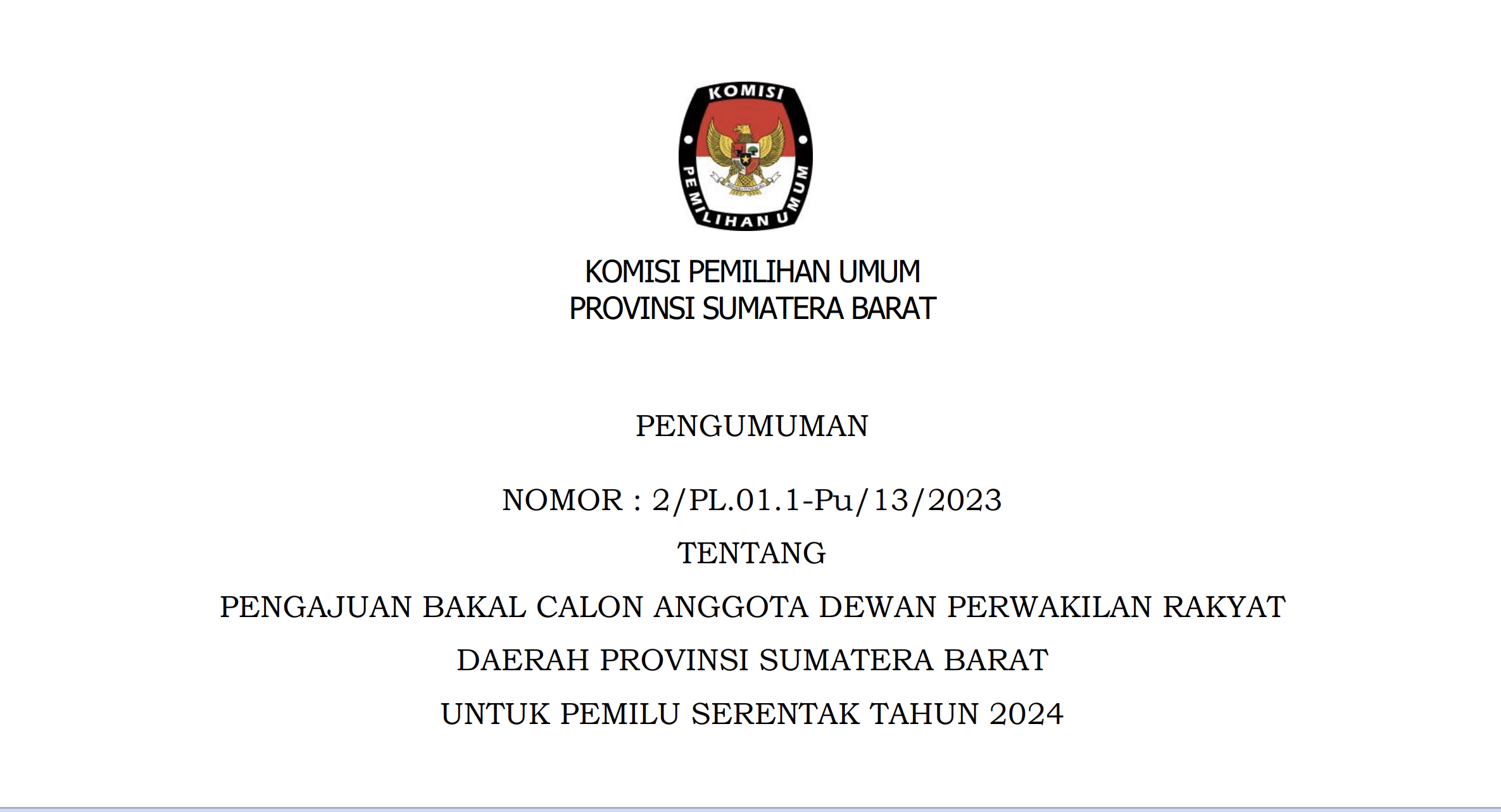 Pengumuman Pengajuan Bakal Anggota DPRD Provinsi Sumbar Pemilu 2024