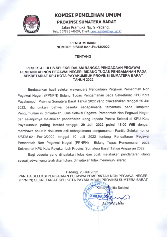 PENGUMUMAN PESERTA LULUS SELEKSI PENGADAAN PEGAWAI PEMERINTAH NON PEGAWAI NEGERI (PPNPN) TUGAS PENGAMANAN SEKRETARIAT KPU KOTA PAYAKUMBUH PROVINSI SUMATERA BARAT TAHUN ANGGARAN 2022