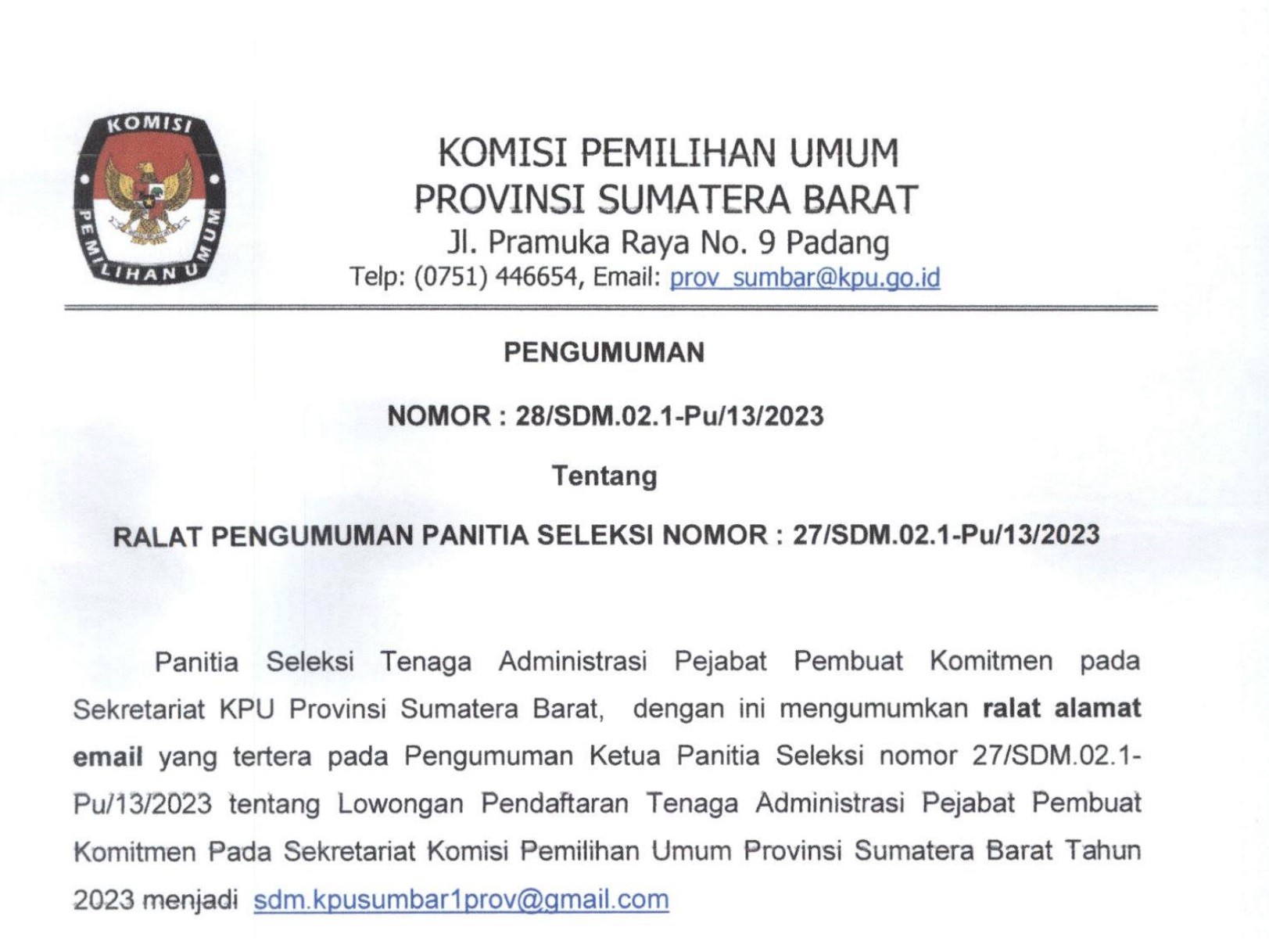 PENGUMUMAN RALAT PENGUMUMAN PANITIA SELEKSI NOMOR 27/SDM.02.1-Pu/13/2023 Selasa, 07 November 2023 00:00 76 PENGUMUMAN Bagikan: Dilihat 76 Kali.