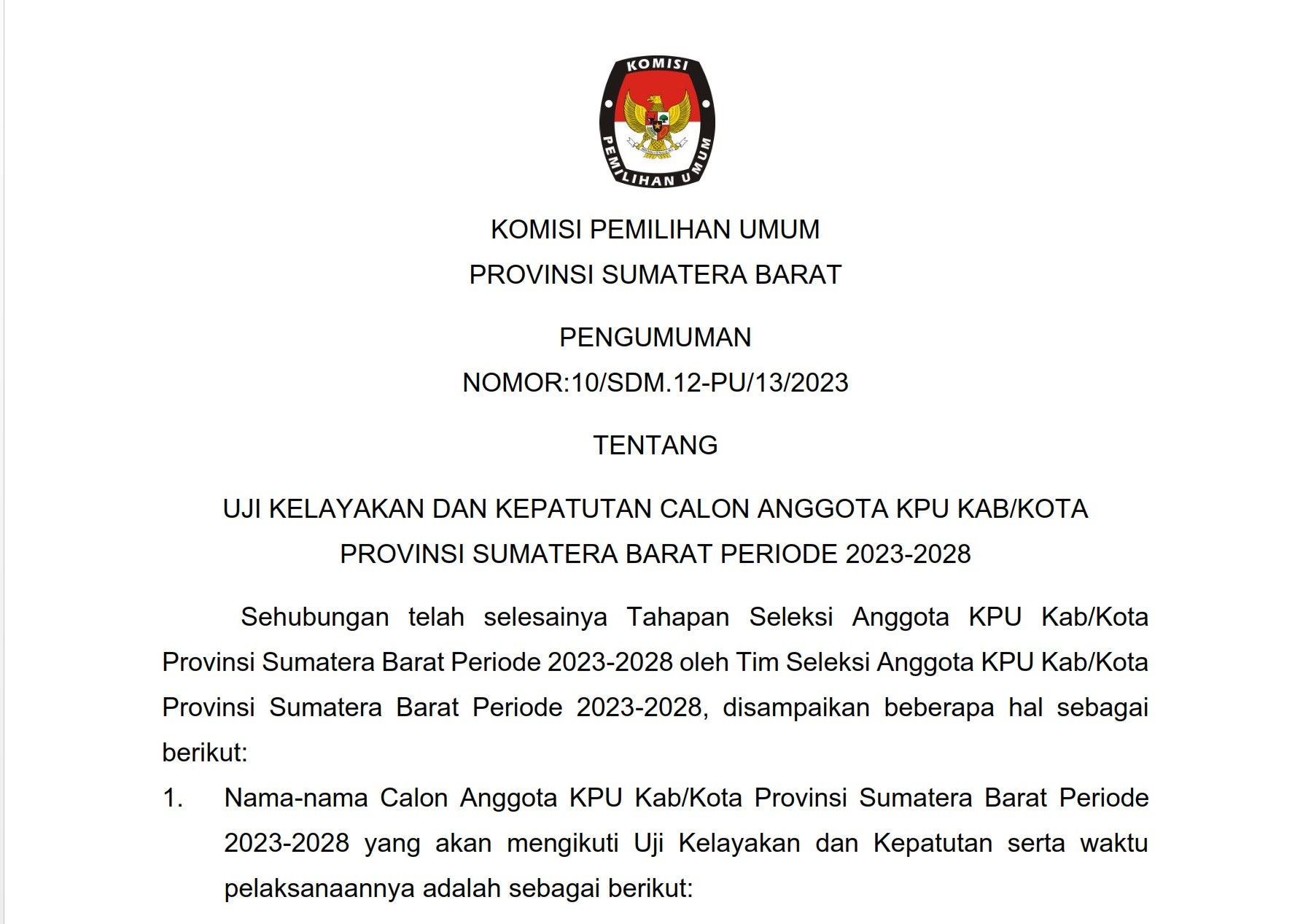 PENGUMUMAN NOMOR:10/SDM.12-PU/13/2023 TENTANG UJI KELAYAKAN DAN KEPATUTAN CALON ANGGOTA KPU KAB/KOTA PROVINSI SUMATERA BARAT PERIODE 2023-2028