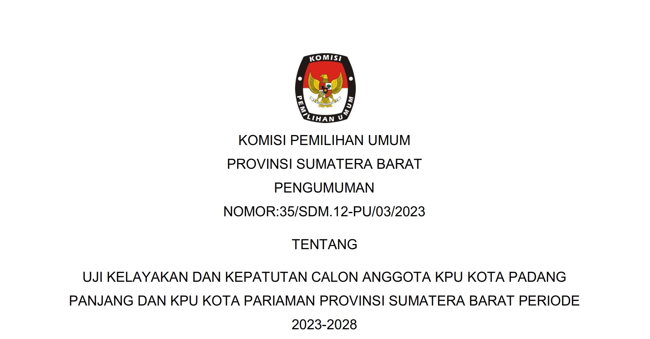 PENGUMUMAN TENTANG UJI KELAYAKAN DAN KEPATUTAN CALON ANGGOTA KPU KOTA PADANG PANJANG DAN KPU KOTA PARIAMAN PROVINSI SUMATERA BARAT PERIODE 2023-2028 Sabtu, 30 September 2023 00:00 436 PENGUMUMAN Bagikan: Dilihat 436 Kali.