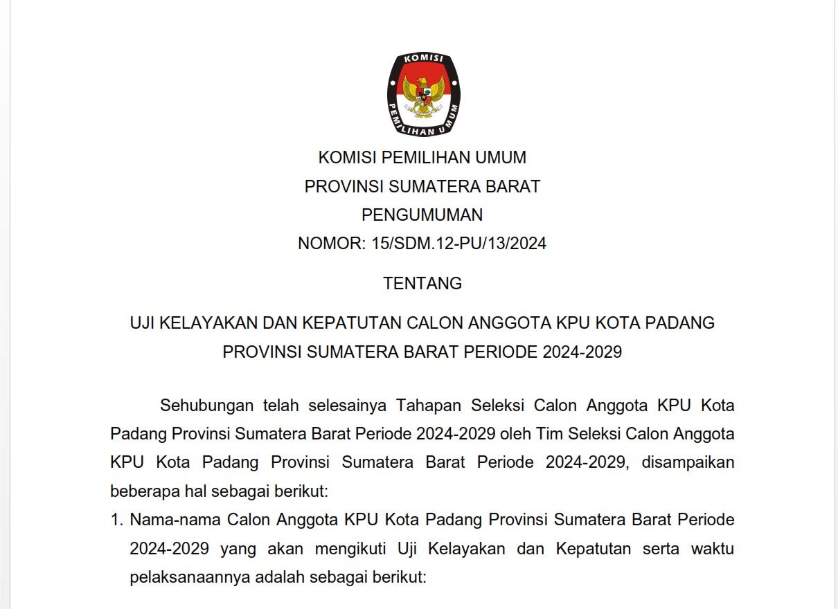 PENGUMUMAN UJI KELAYAKAN DAN KEPATUTAN CALON ANGGOTA KPU KOTA PADANG PROVINSI SUMATERA BARAT PERIODE 2024-2029 Kamis, 25 April 2024 00:00 201 PENGUMUMAN Bagikan: Dilihat 201 Kali.