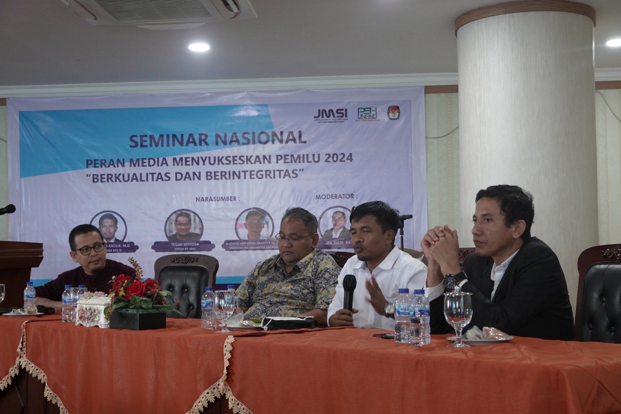 Seminar Nasional dengan tema Peran Media Menyukseskan Pemilu 2024 Berkualitas dan Berintegritas dibuka oleh Asisten Administrasi Umum Sekdaprov Sumbar, Andri Yulika. Hadir juga sebagai narasumber Harry Efendi Iskandar, akademisi Universitas Andalas dan Ketua Umum PP JMSI, Teguh Santosa.
