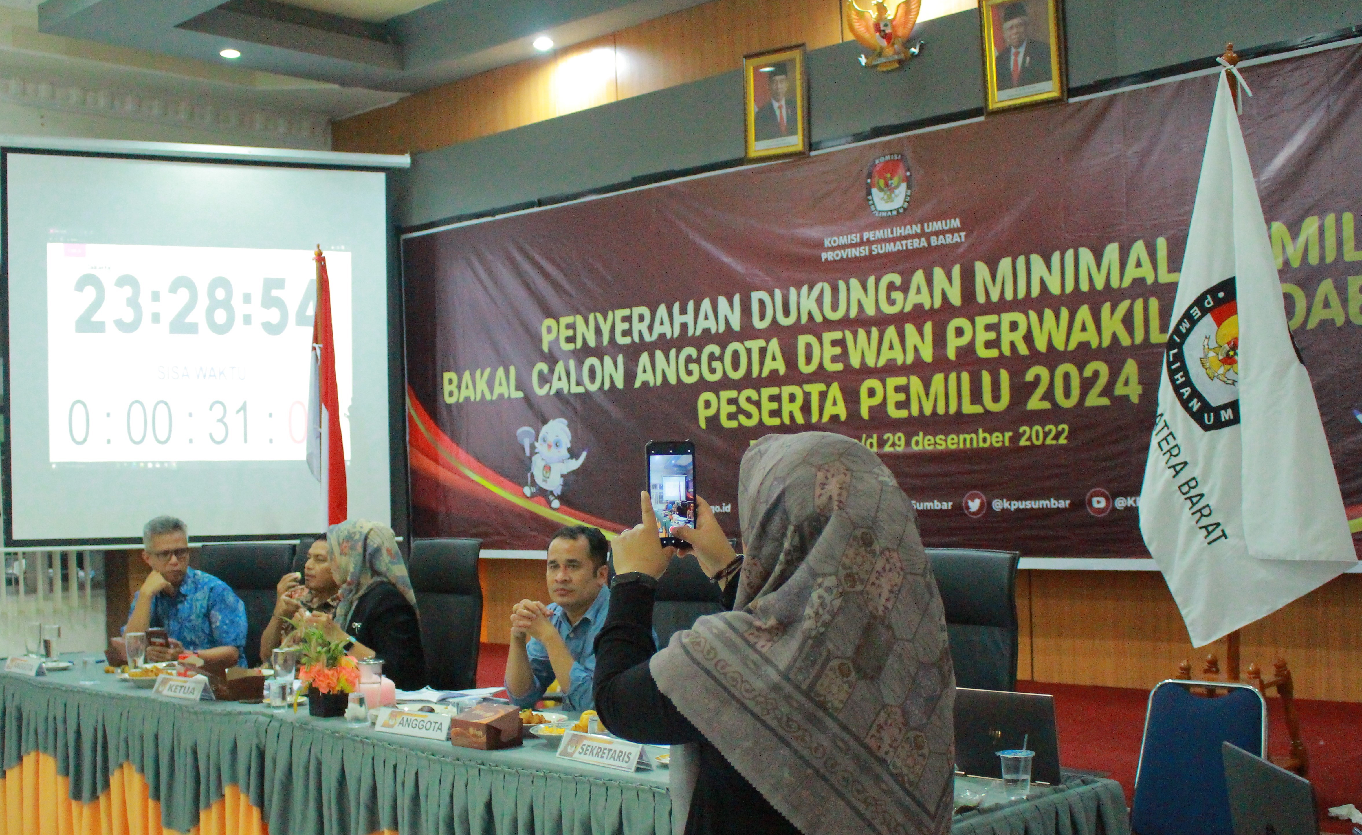 Padang, sumbar.kpu.go.id – Kamis, 29 Desember 2022 pukul 23.59 WIB menjadi detik-detik terakhir sebelum penutupan masa penyerahan dukungan minimal pemilih bagi calon anggota Dewan Perwakilan Daerah (DPD) calon peserta Pemilu Serentak 2024. Komisi Pemilihan Umum Provinsi Sumatera Barat (KPU Sumbar) telah melakukan penerimaan penyerahan dukungan minimal pemilih untuk calon perseorangan DPD sejak 16 Desember lalu. Namun masa-masa awal penyerahan dukungan ini belum dimanfaatkan bakal calon.