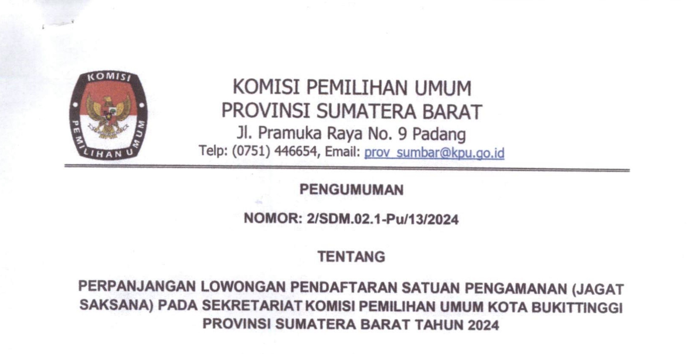 Perpanjangan Pendaftaran Satuan Pengamanan (Jagat Saksana) Sekretariat KPU Kota Bukittinggi Provinsi Sumatera Barat Tahun 2024 Rabu, 10 Januari 2024 00:00 82 PENGUMUMAN CONTOH FORM SURAT LAMARAN CONTOH FORM DAFTAR RIWAYAT HIDUP CONTOH FORM TIDAK PERNAH DIBERHENTIKAN CONTOH FORM SURAT PERNYATAAN TIDAK PERNAH MENJADI ANGGOTA/PENGURUS PARTAI POLITIK/TERLIBAT POLITIK PRAKTIS Bagikan: Dilihat 82 Kali.
