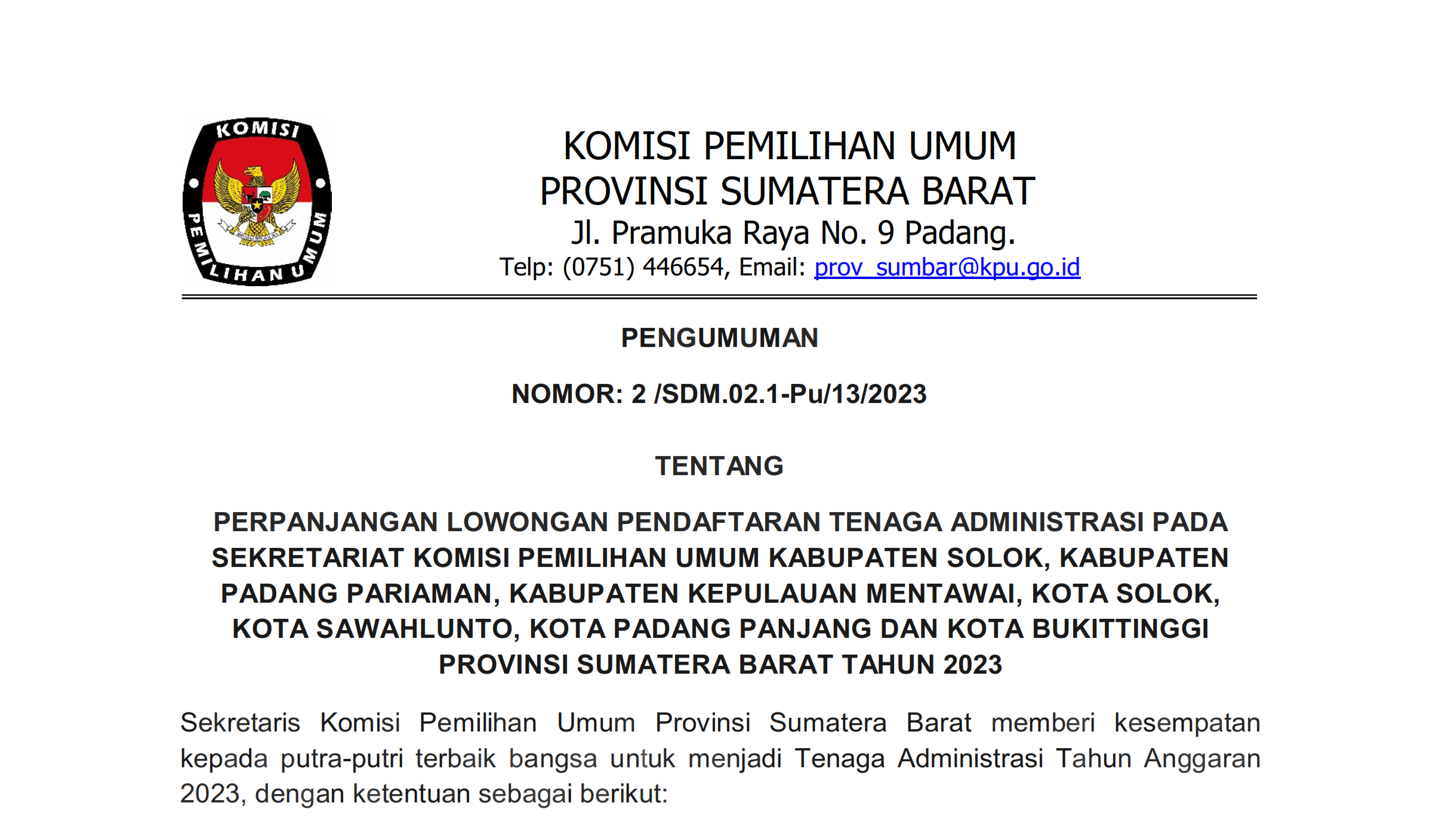 PENGUMUMAN NOMOR: 2 /SDM.02.1-Pu/13/2023 TENTANG PERPANJANGAN LOWONGAN PENDAFTARAN TENAGA ADMINISTRASI PADA SEKRETARIAT KOMISI PEMILIHAN UMUM KABUPATEN SOLOK, KABUPATEN PADANG PARIAMAN, KABUPATEN KEPULAUAN MENTAWAI, KOTA SOLOK, KOTA SAWAHLUNTO, KOTA PADANG PANJANG DAN KOTA BUKITTINGGI PROVINSI SUMATERA BARAT TAHUN 2023